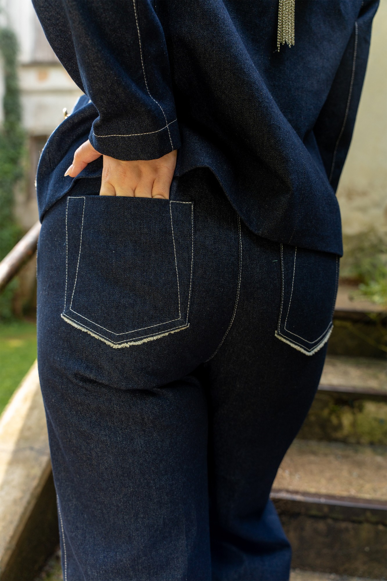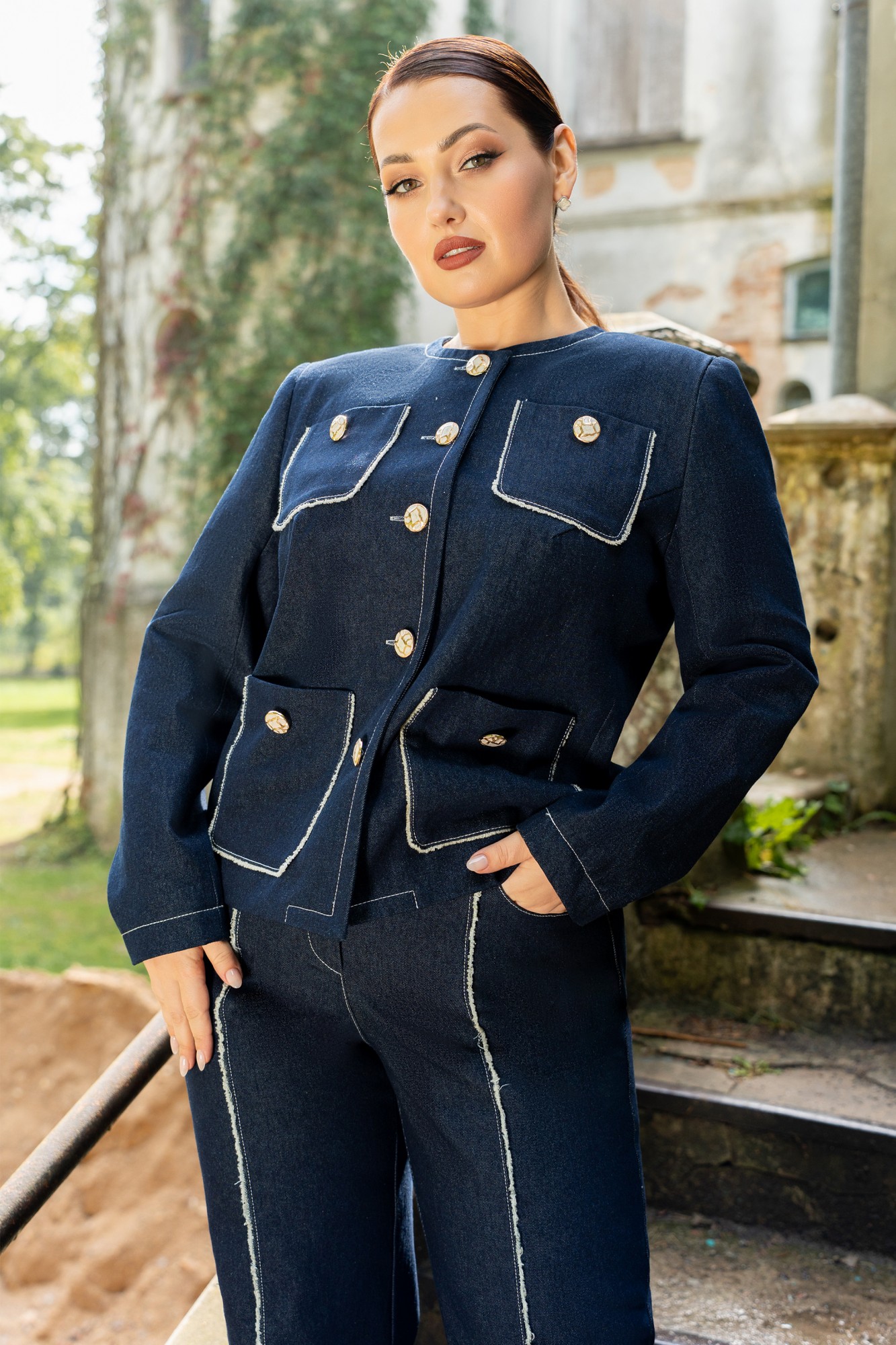Брюки женские прямого силуэта, современная классическая, по переду пояс со шлёвками, и застёжка на тесьму-молнию и пуговицу, по спинке пояс с эластичной резинкой. Брюки с боковыми наклонными карманами. Брюки со складками по переду. Задние половинки с накладными фигурными карманами с бахромой.