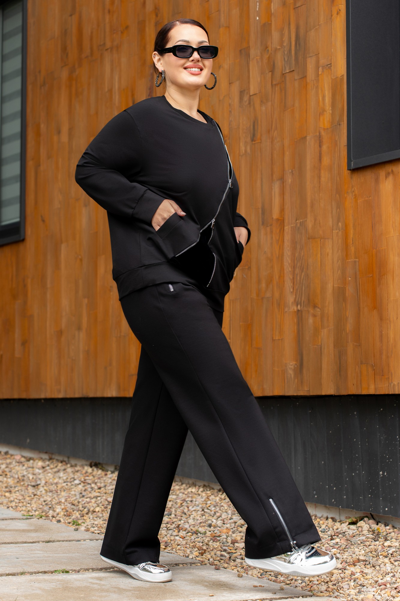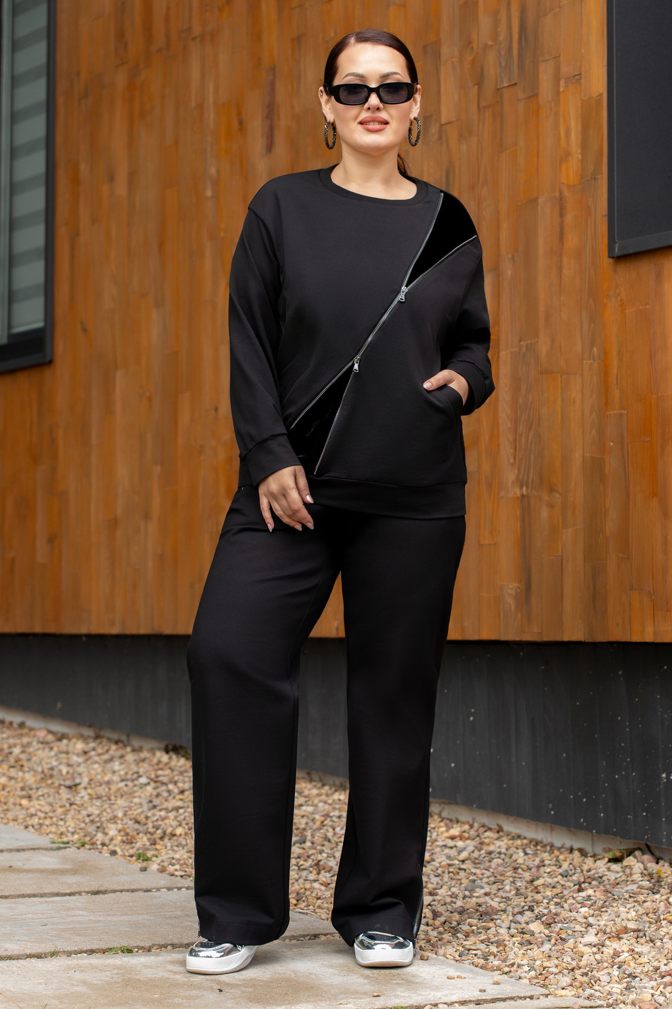 Брюки женские прямого силуэта, пояс на резинке. Боковые карманы на молниях. По низу брюк обработаны разрезы на молниях.