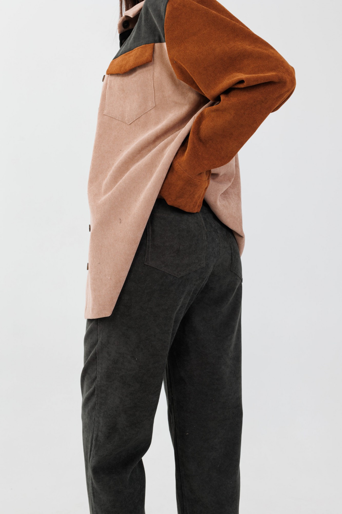 Брюки из штруксовый ткани, полуприлегающего силуэта, с посадкой на линии талии. Зауженные книзу за счёт вытачек по передним и задним частям. На передних частях брюк обработаны карманы с отрезным бочком.
