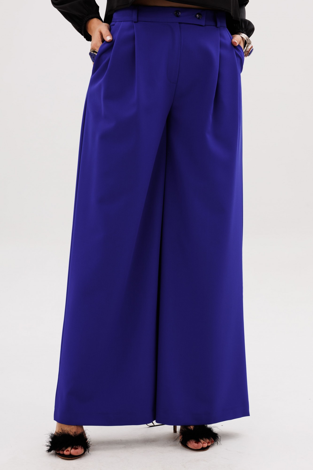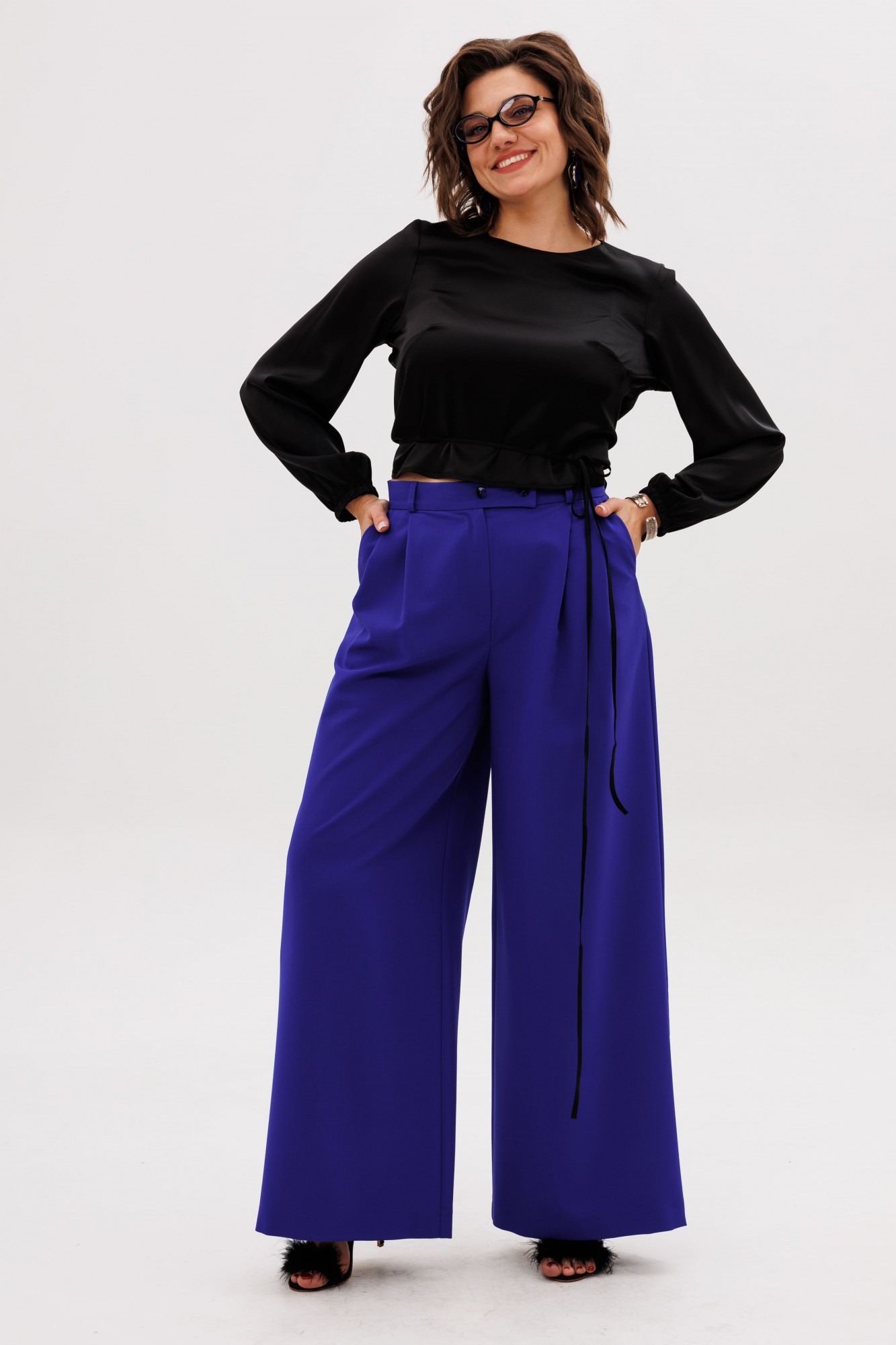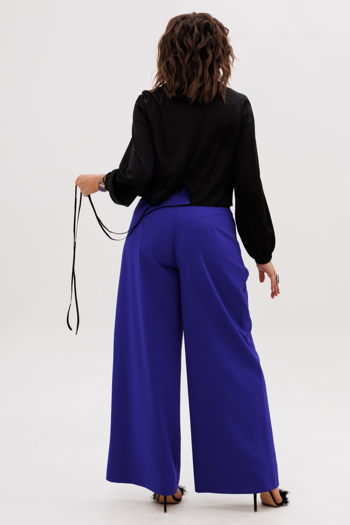 Элегантные брюки-палаццо с современным силуэтом. Модель отличается безупречным кроем с высокой посадкой, который подчеркивает талию и создает выразительный удлиненный контур. Широкие, ниспадающие мягкими складками штанины дарят образу воздушность и непринужденную пластику.
