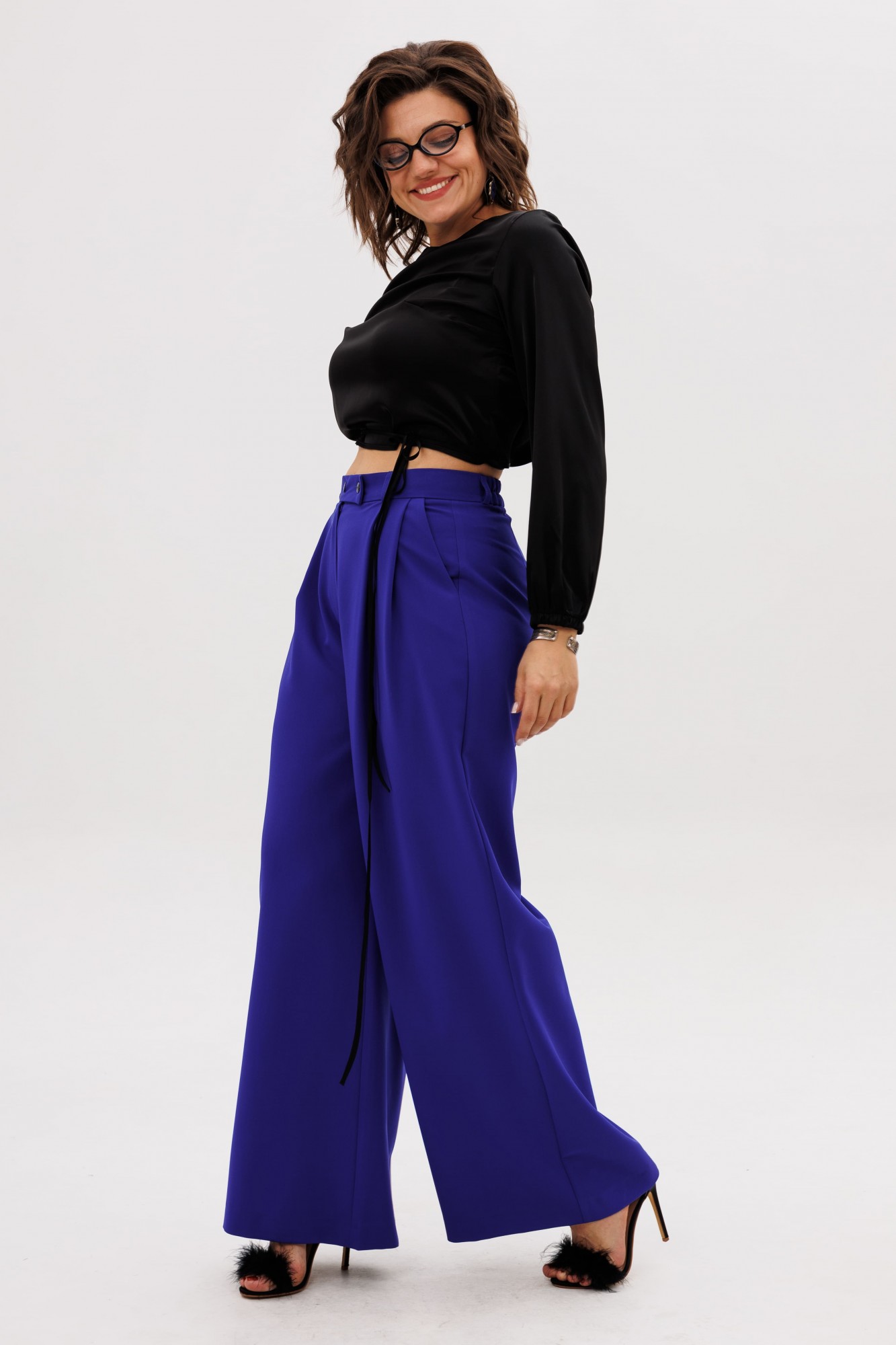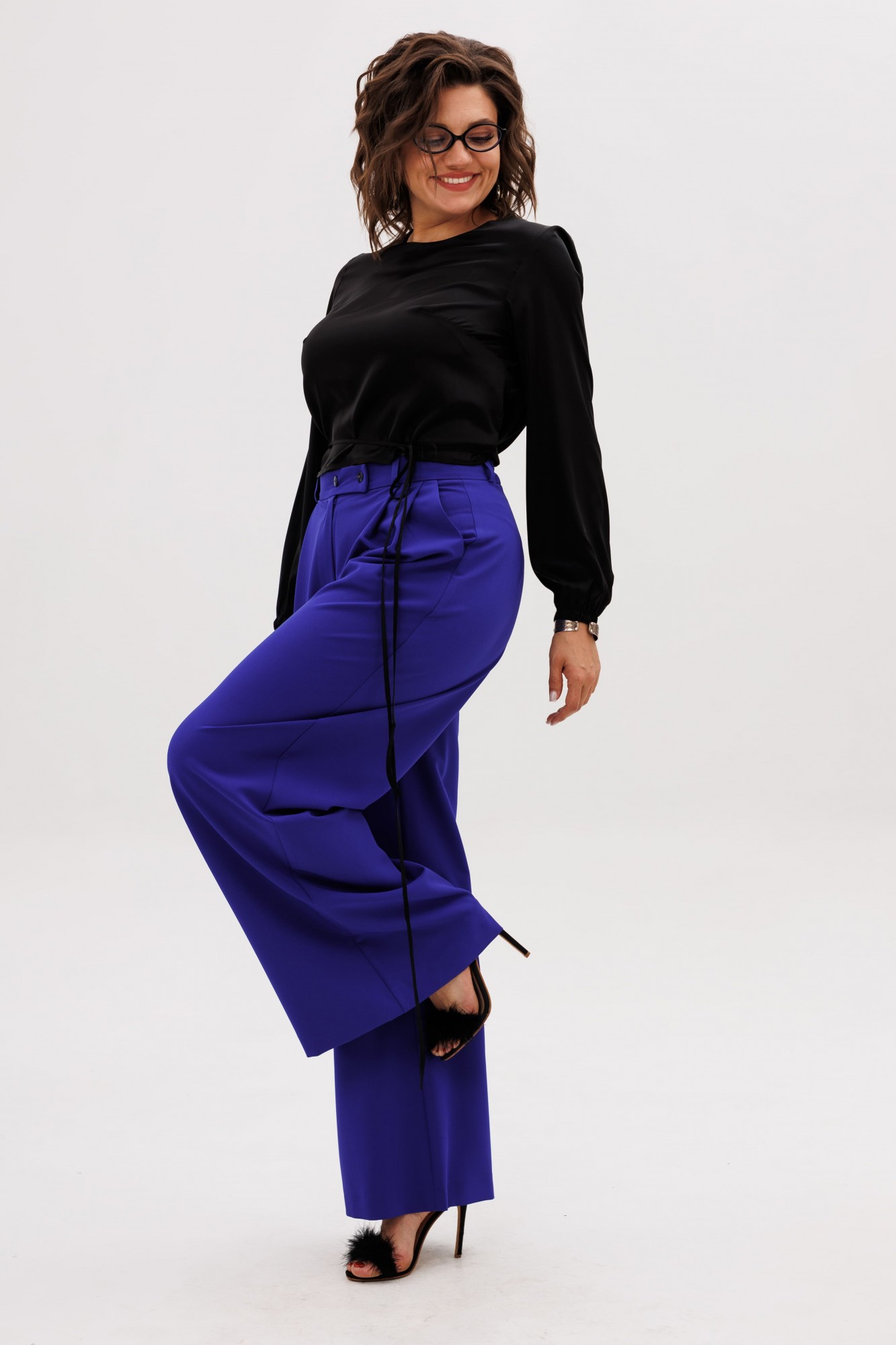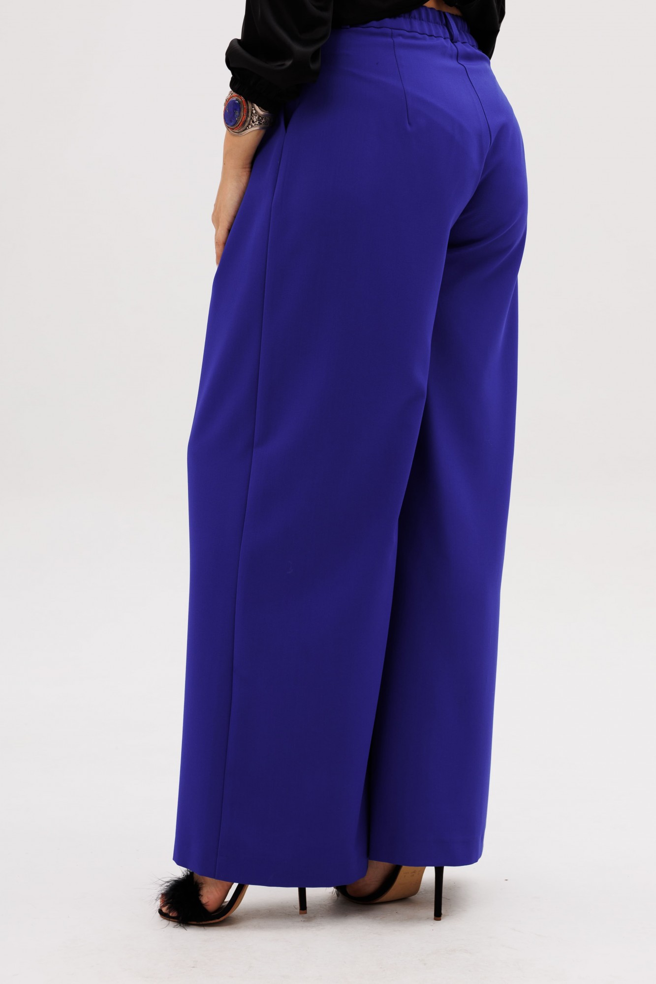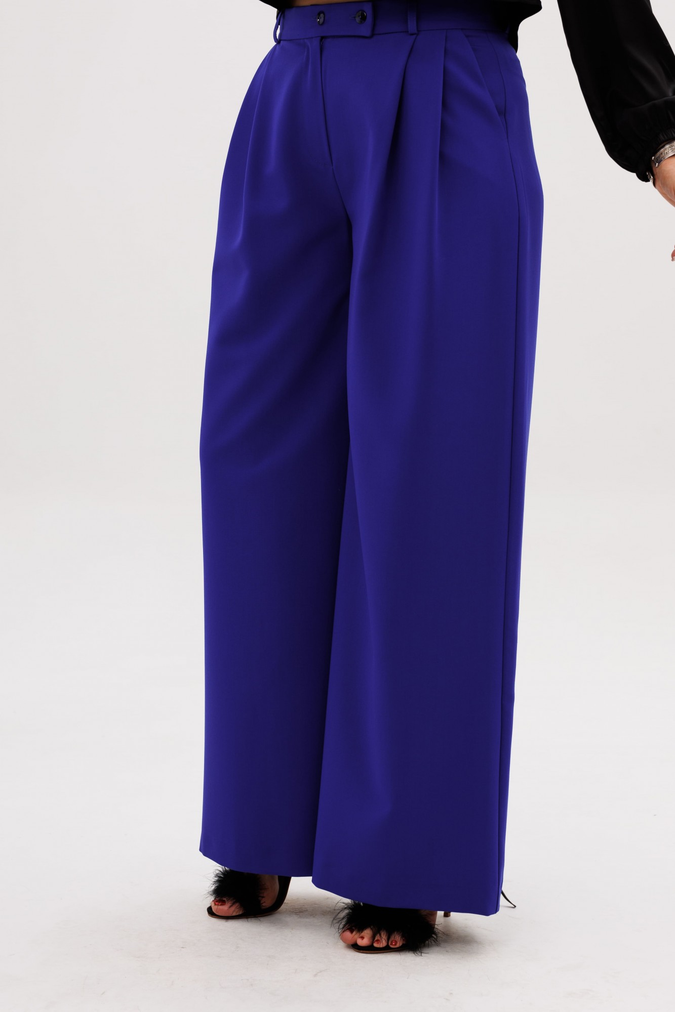 Элегантные брюки-палаццо с современным силуэтом. Модель отличается безупречным кроем с высокой посадкой, который подчеркивает талию и создает выразительный удлиненный контур. Широкие, ниспадающие мягкими складками штанины дарят образу воздушность и непринужденную пластику.