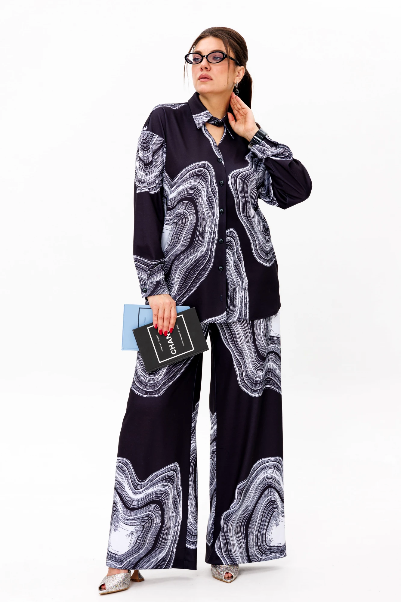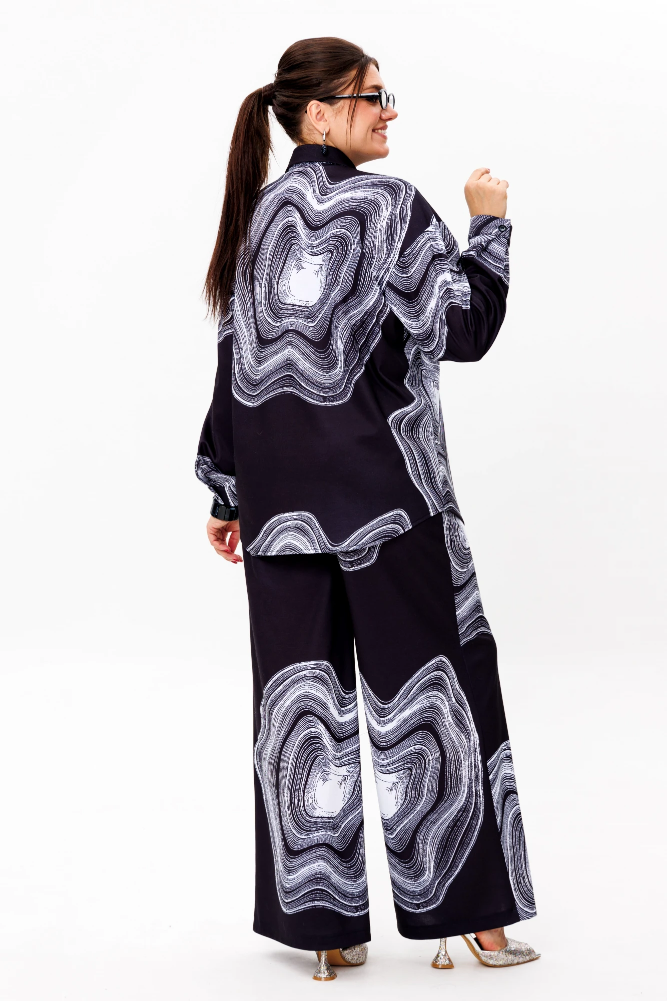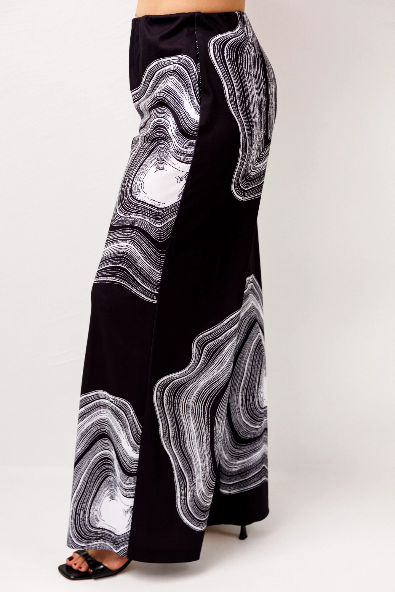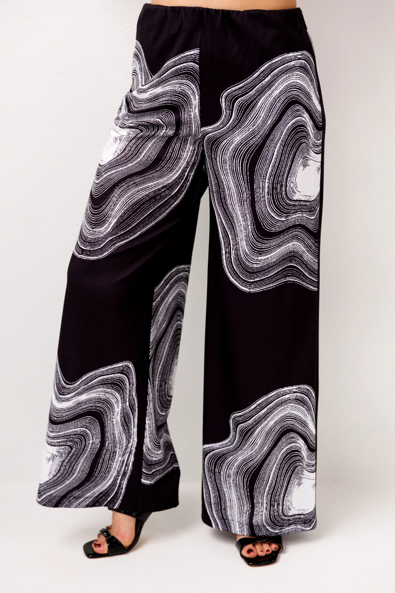 Главным акцентом становится необычный и уникальный принт - выразительный, запоминающийся, созданный для тех, кто любит выделяться и чувствовать себя особенной даже в буднях. Брюки легко вписываются в ежедневный гардероб, сочетаясь с базовыми вещами или становясь частью эффектного ансамбля.
