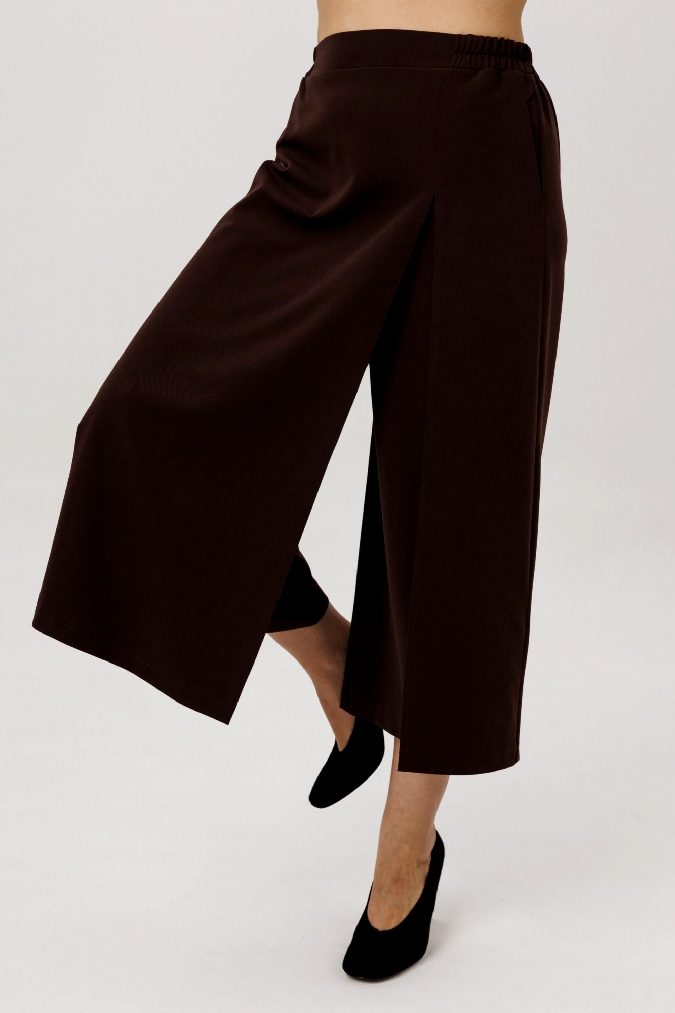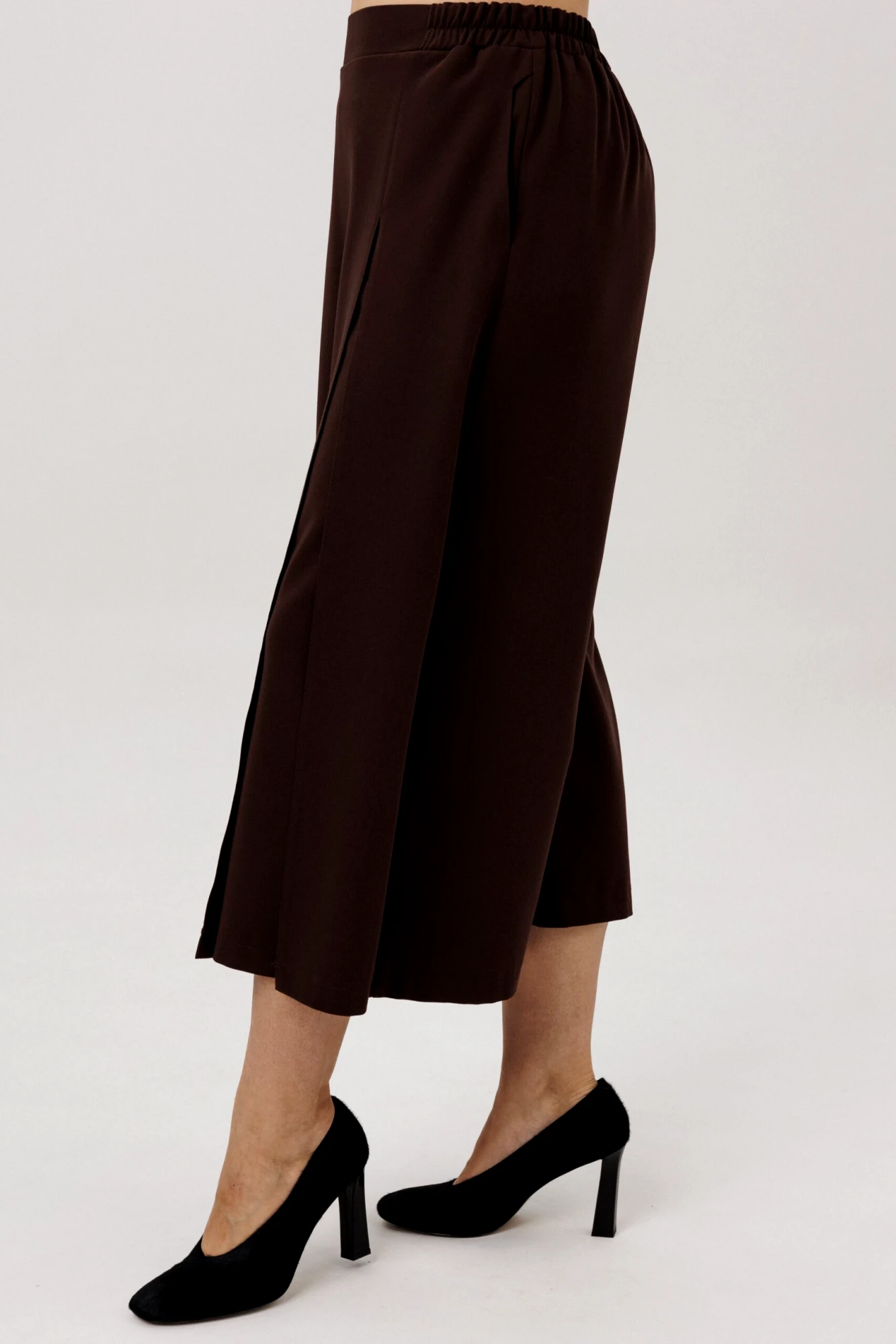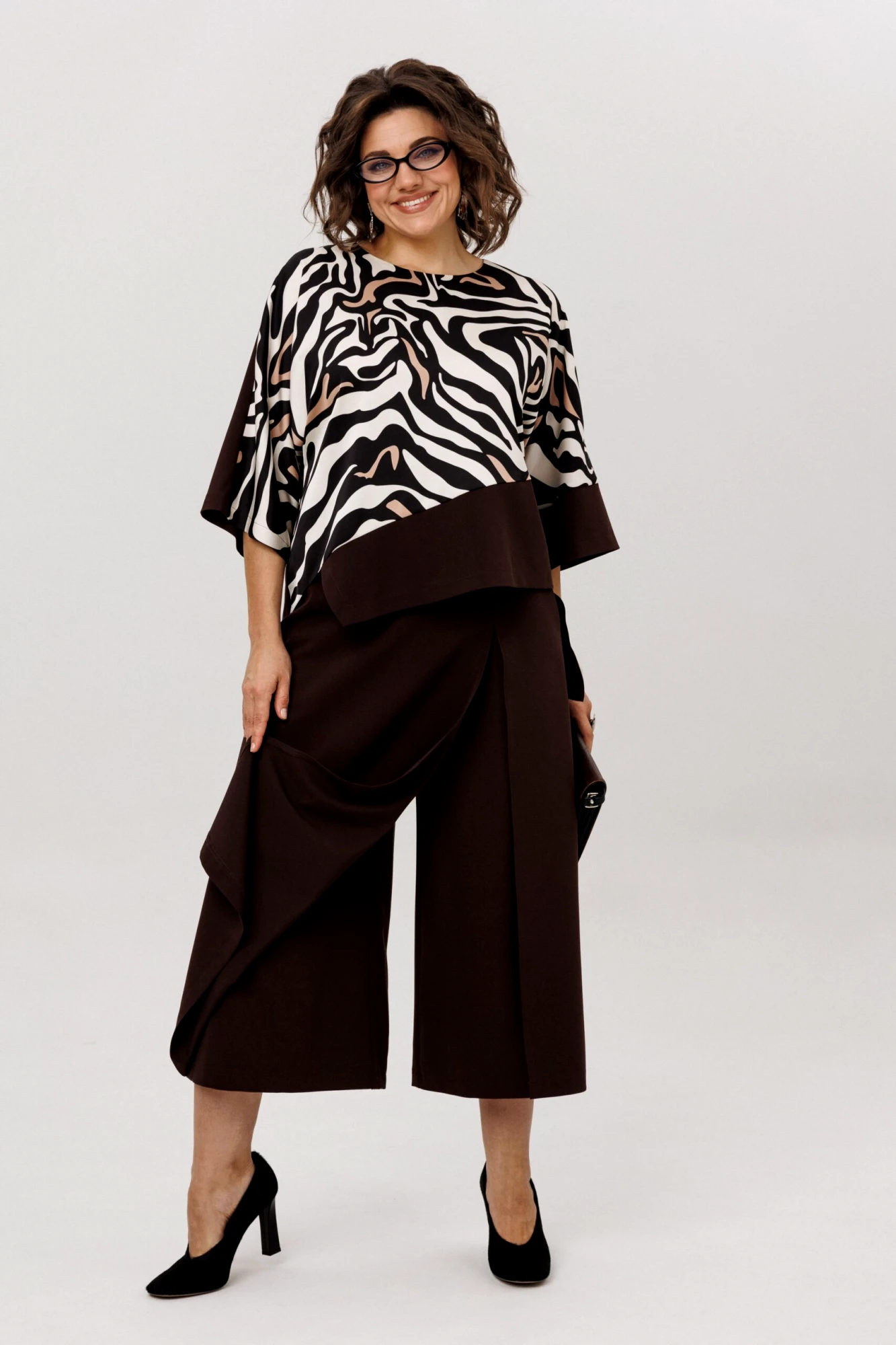 Эта юбка-брюки от Анелли, парящая на грани изящной юбки и уверенных брюк, создана для тех, кто ценит свободу движения и безупречный силуэт. Её лёгкий, струящийся крой мягко обнимает талию, подчеркивая линию бёдер, и плавно расширяется книзу, создавая элегантный и динамичный фасон. Пояс на резинке, дарит комфорт и идеальную посадку, а два фигурных кармана добавляют необычную деталь, подчёркивая индивидуальность модели. Эти юбка-брюки-кюлоты в базальтовом цвете - прекрасный синтез повседневной лёгкости и особенного стиля. Эта вещь станет вашим любимым спутником, легко преображаясь из дня в день: в паре с воздушной блузой и каблуками она звучит по-деловому изысканно, а с уютным свитером и кедами превращается в идеал расслабленной элегантности. Это та самая вещь, в которой вы чувствуете себя необыкновенно красивой и при этом абсолютно собой. Приобрести юбку-кюлоты можно вместе с блузой в костюмах 1793 и 1793.1. Также на модели кружевной топ 1664, блуза 1663 и 1779.