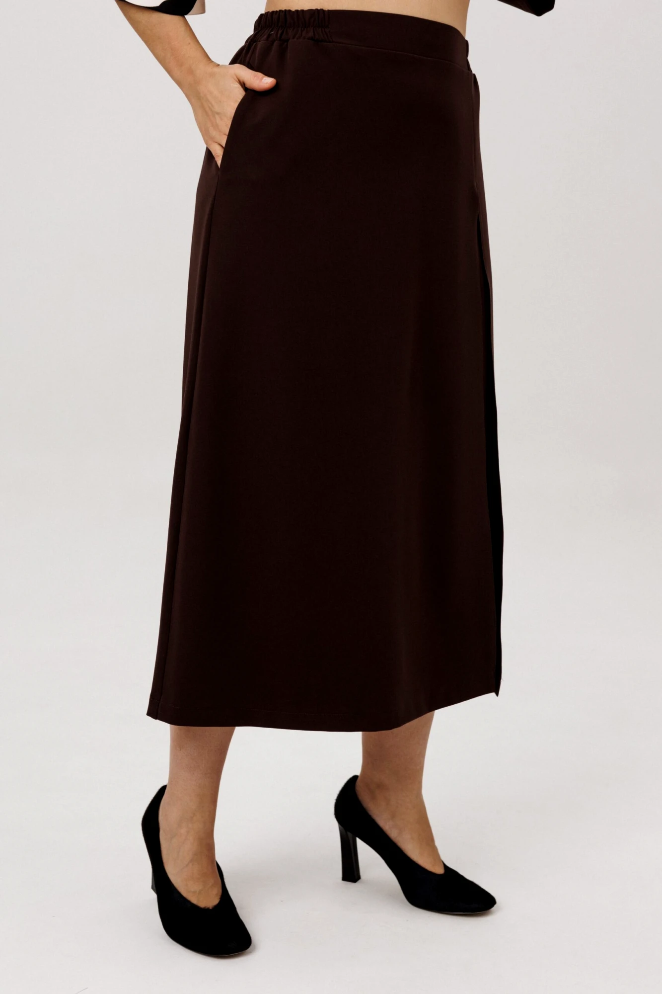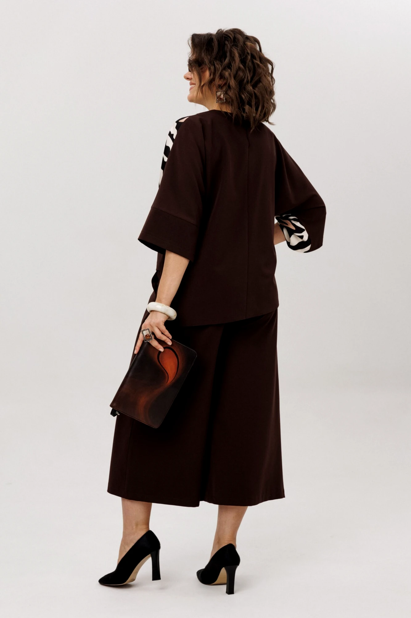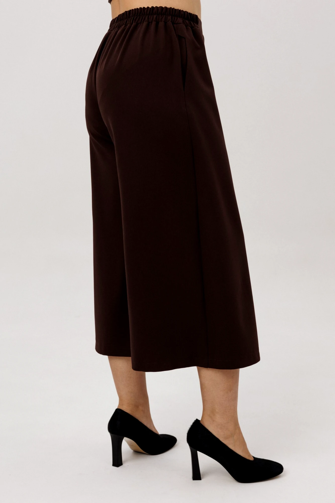 Эта юбка-брюки от Анелли, парящая на грани изящной юбки и уверенных брюк, создана для тех, кто ценит свободу движения и безупречный силуэт. Её лёгкий, струящийся крой мягко обнимает талию, подчеркивая линию бёдер, и плавно расширяется книзу, создавая элегантный и динамичный фасон. Пояс на резинке, дарит комфорт и идеальную посадку, а два фигурных кармана добавляют необычную деталь, подчёркивая индивидуальность модели. Эти юбка-брюки-кюлоты в базальтовом цвете - прекрасный синтез повседневной лёгкости и особенного стиля. Эта вещь станет вашим любимым спутником, легко преображаясь из дня в день: в паре с воздушной блузой и каблуками она звучит по-деловому изысканно, а с уютным свитером и кедами превращается в идеал расслабленной элегантности. Это та самая вещь, в которой вы чувствуете себя необыкновенно красивой и при этом абсолютно собой. Приобрести юбку-кюлоты можно вместе с блузой в костюмах 1793 и 1793.1. Также на модели кружевной топ 1664, блуза 1663 и 1779.