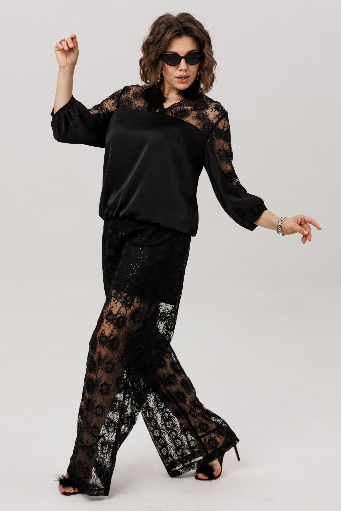 Волнующий шёпот гипюра и танец мерцающих пайеток. Эти брюки «звездная паутинка» не просто деталь образа, а его поэтичное завершение, где дерзость встречается с изящностью.