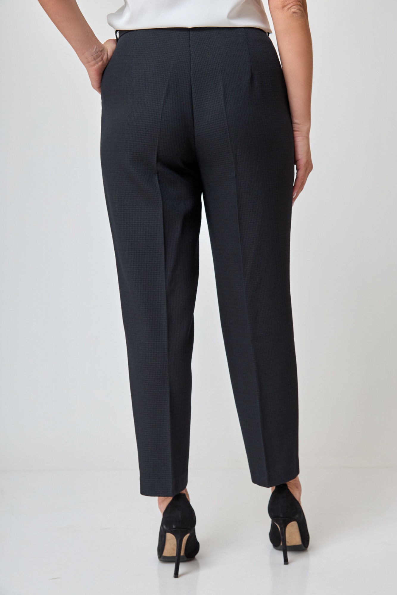 По верху брюк притачной пояс с застежкой на петли и пуговицы, и шлевками для пояса. На передних половинках обработаны наклонные функциональные карманы и застежка молния в среднем шве. По переду и по спинке с вытачками.