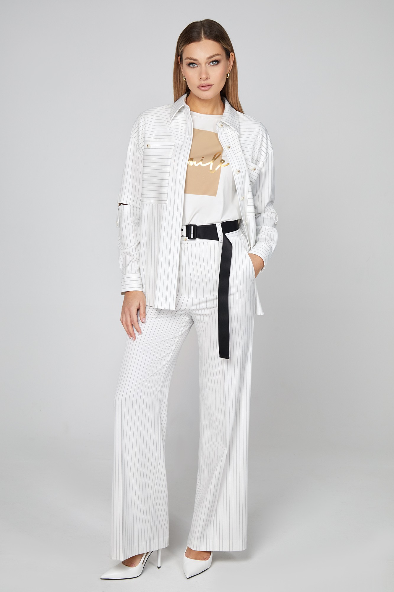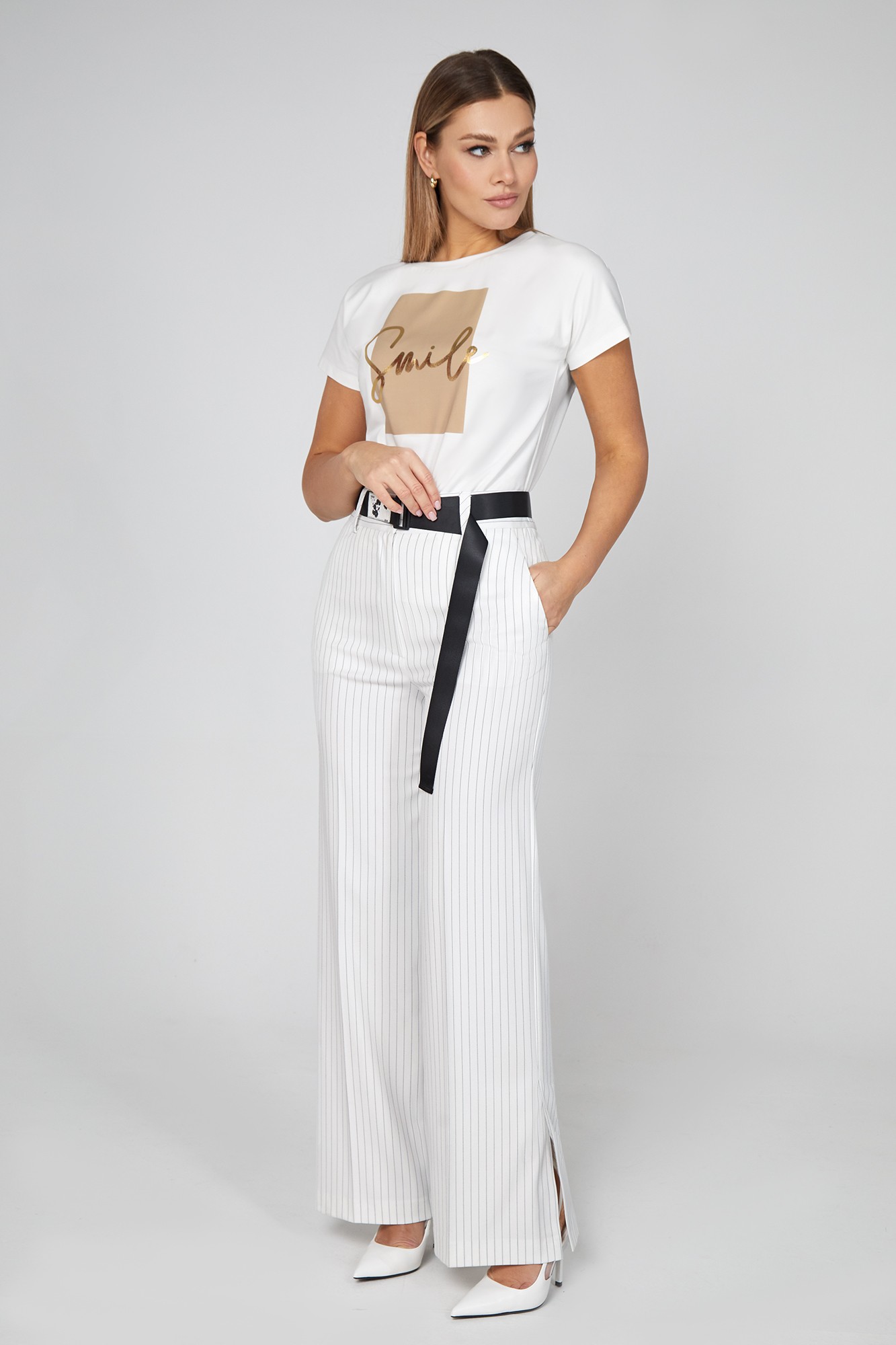 Модное обновление: эти светлые широкие брюки с полосатым узором из эластичной поливискозной испанской ткани привнесут глоток свежего воздуха в ваш гардероб. Современный дизайн в сочетании с модным кроем делают эту базовую модель привлекательной. Изделие на притачном поясе со шлёвками, собранном на эластичную тесьму по спинке, спереди застёжка на молнию и петли-пуговицы и функциональные косые карманы. Модель дополнена контрастным поясом-тесьмой с пряжками, делающим образ более современным. Идеальный стиль с соответствующим жакетом или блузкой для городского модного образа.