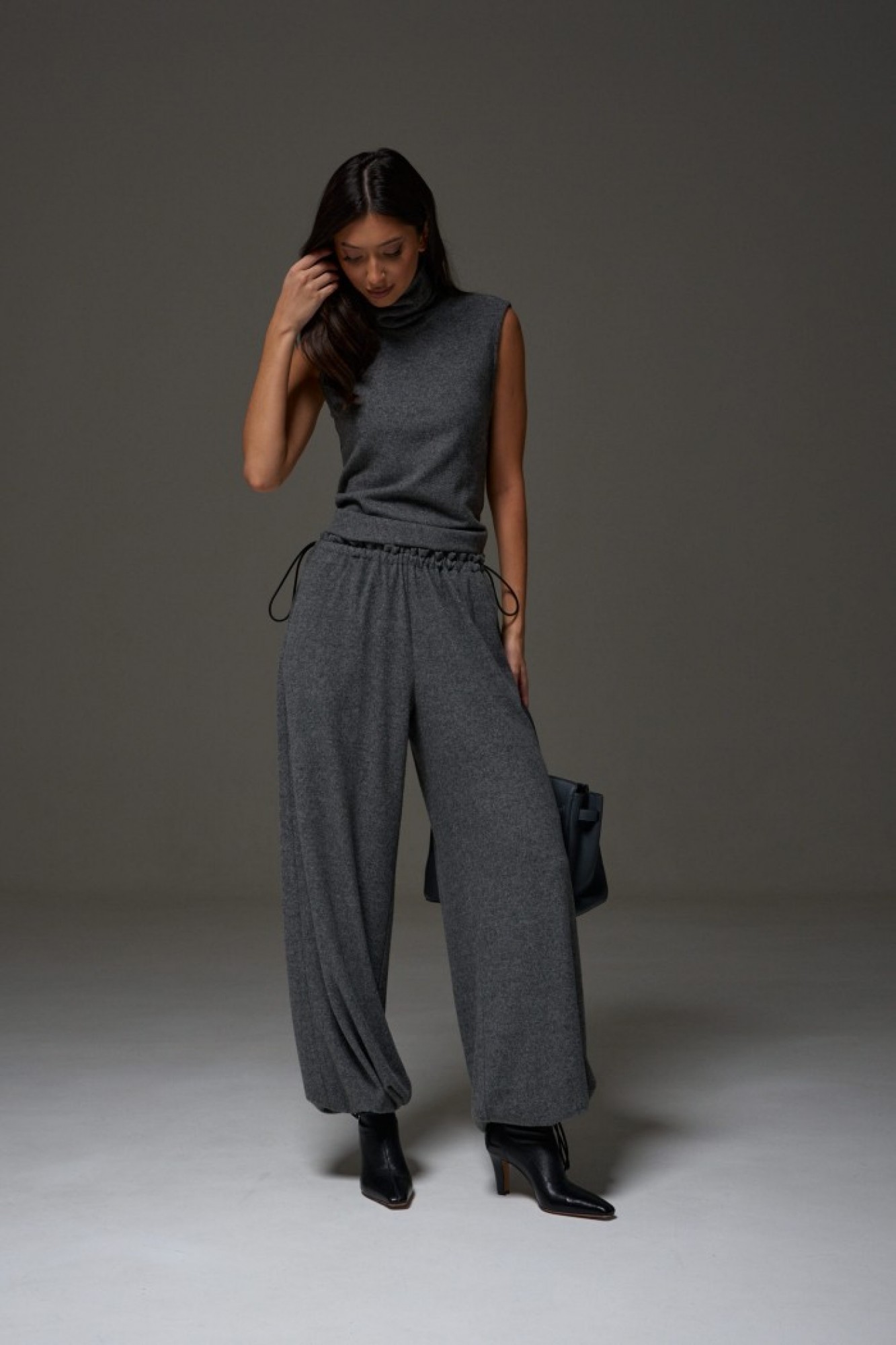 Брюки-джоггеры. Выполнены из мягкого ворсистого трикотажного полотна серого цвета. Характеристики: прямой крой, пояс на шнурке-резинке с фиксатором, в боковых швах карманы, штанина внизу на резинке с фиксатором.