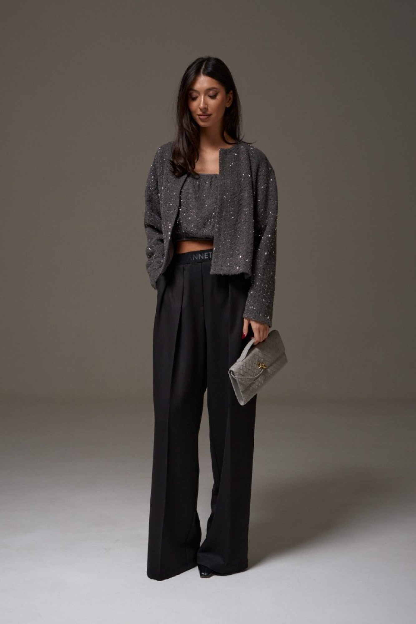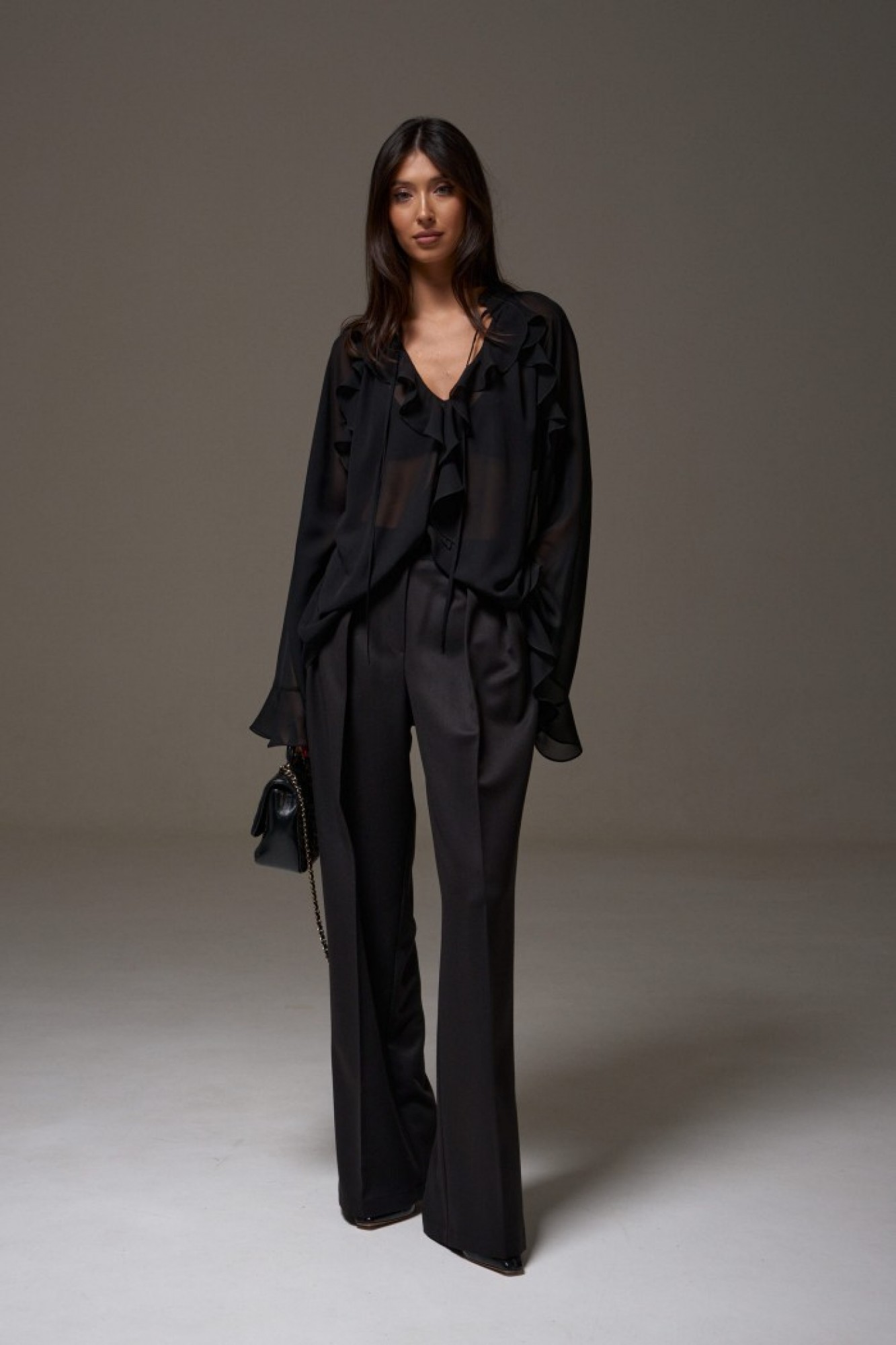 Брюки прямого кроя выполнены из ткани черного цвета. Характеристики: прямой крой, эластичная брендированная резинка, боковые карманы, на передней и задней частях брюк застрочены складки и заутюжены стрелки.