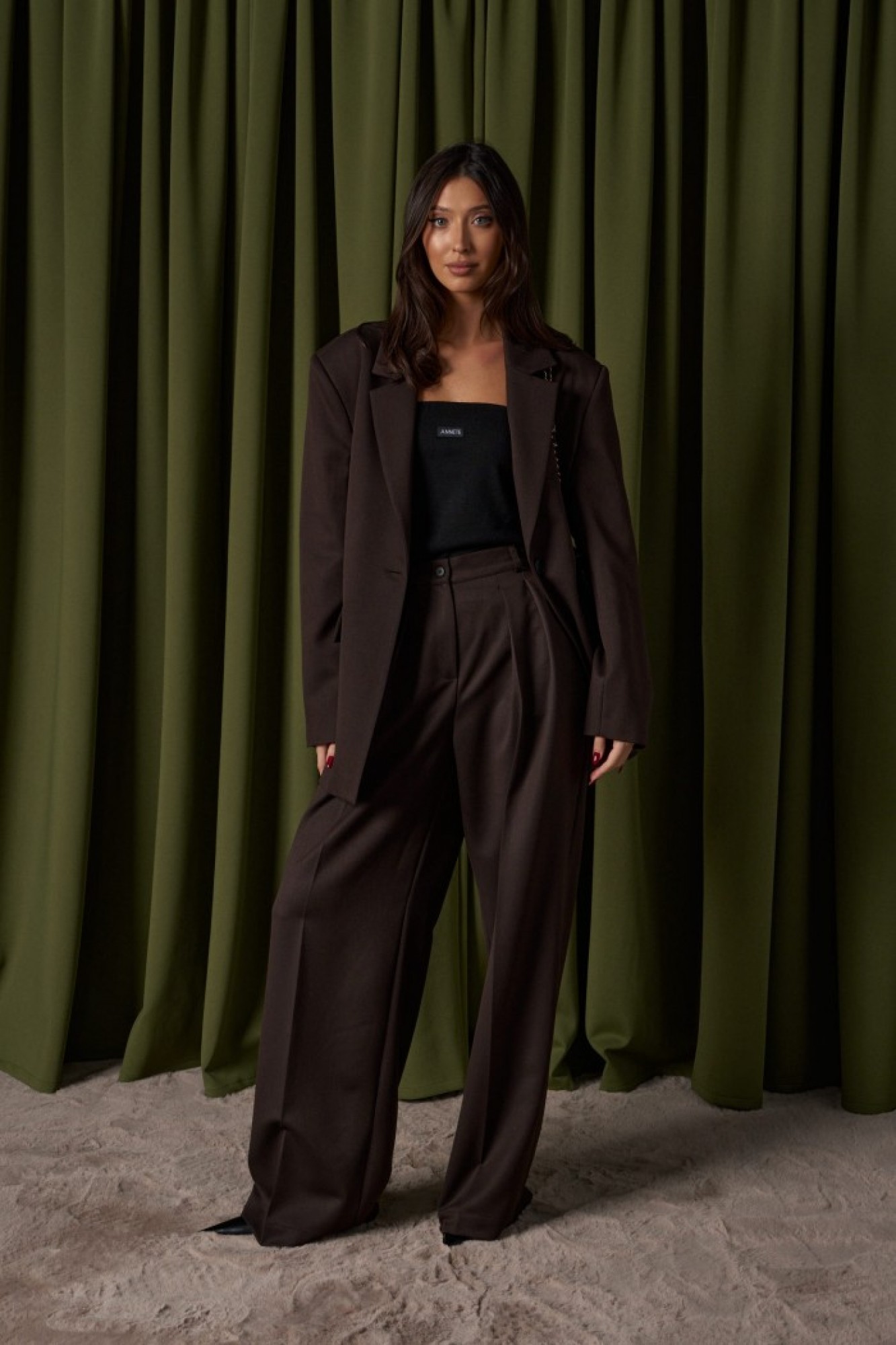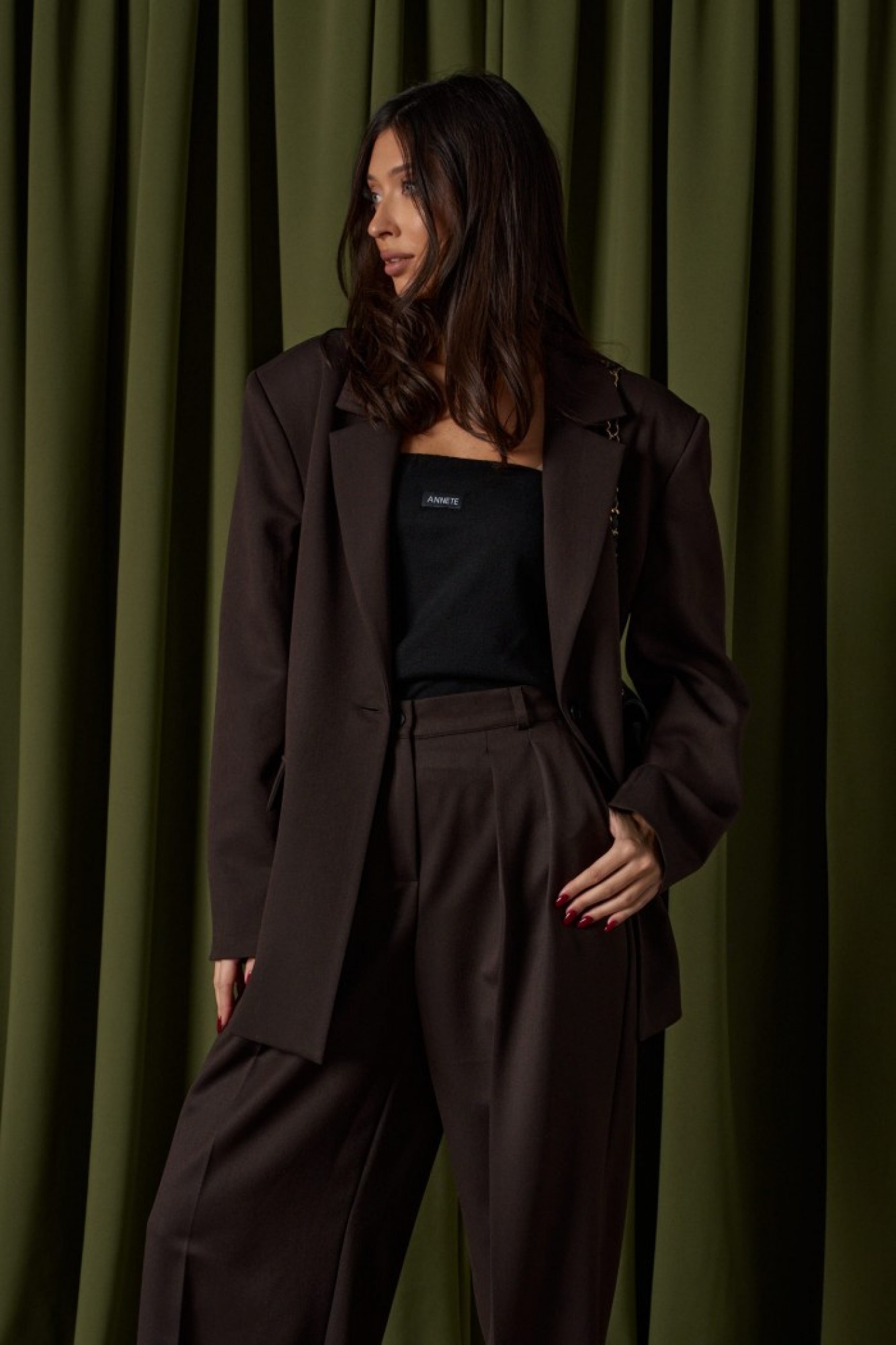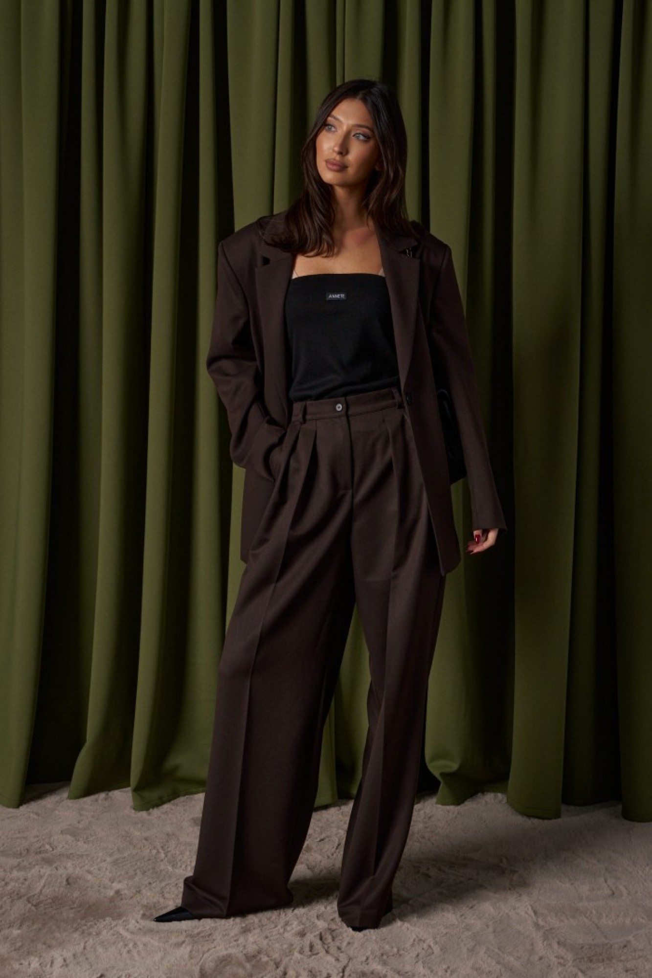 Брюки прямого свободного кроя выполнены из полотна коричневого цвета. Характеристики: прямой крой, пояс стабильный, по поясу нашиты шлевки, декоративная сборка по передней части, заутюженные стрелки по передней и задней части брюк.