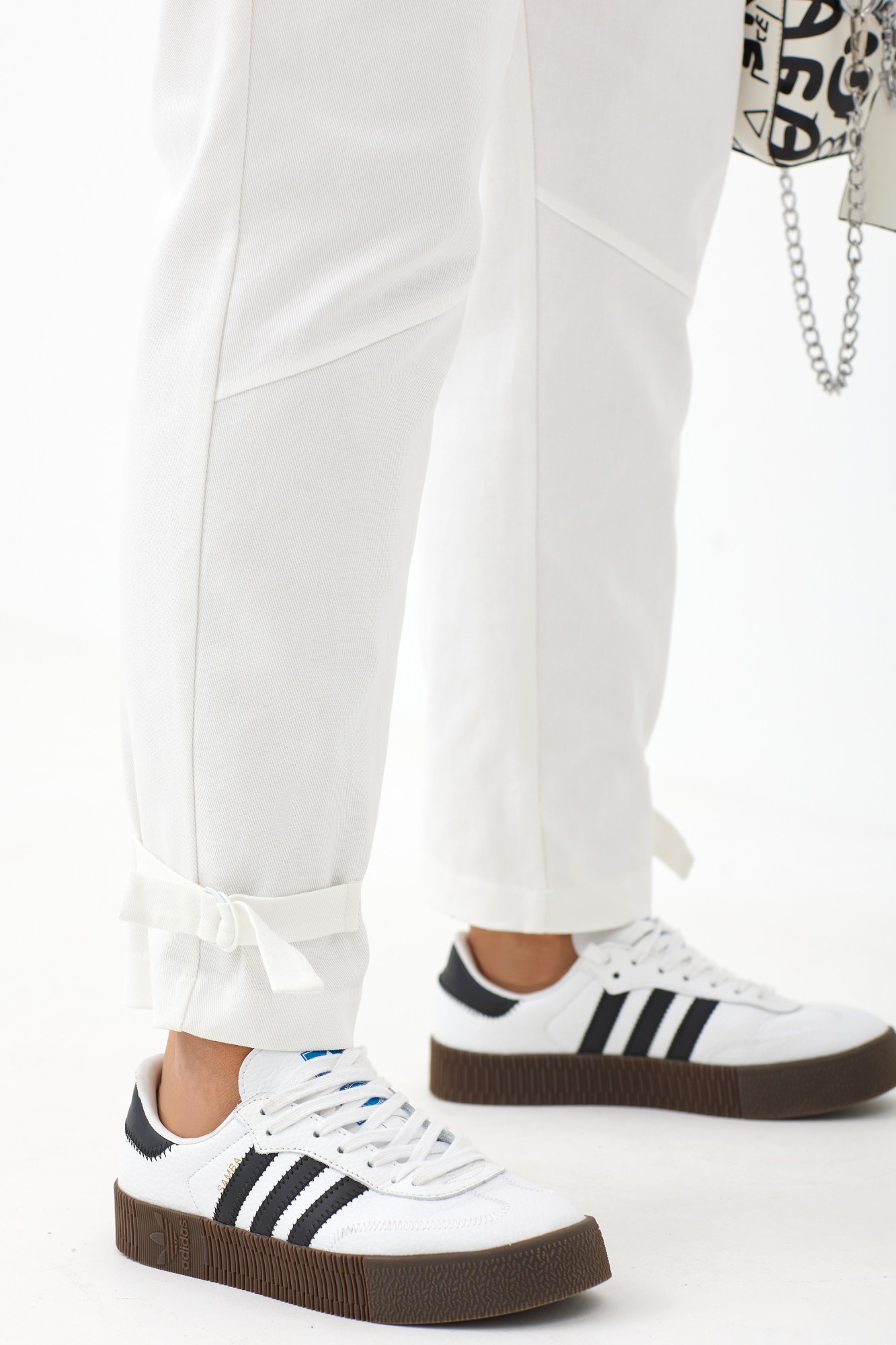 Необычайно удобные, стильные джинсовые молочные брюки в стиле кэжуал непременно поднимут Вам настроение и гармонично впишутся в гардероб. С ними можно создавать множество интересных и ярких образов. Выполнены из плотного благородного, хлопкового джинса со стрейчем в крупный рубчик, который отлично держит форму, за счёт чего скрывает неровности фигуры. Пояс притачной, на эластичной резинке. По передней части на поясе выполнен «островок», что позволяет визуально скрыть животик. По задней части брюк - кокетка, которая делает посадку брюк идеальной. Передняя часть разрезная. Диагональный срез позволяет визуально «вытянуть» ножку. На нижней части брюк, имеются функциональные надстрочные паты с полукольцами, за счёт которых можно регулировать ширину брюк по низу. Брюки можно приобрести в комплекте с бомбером, артикул 2013.