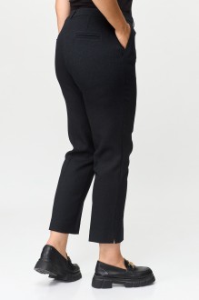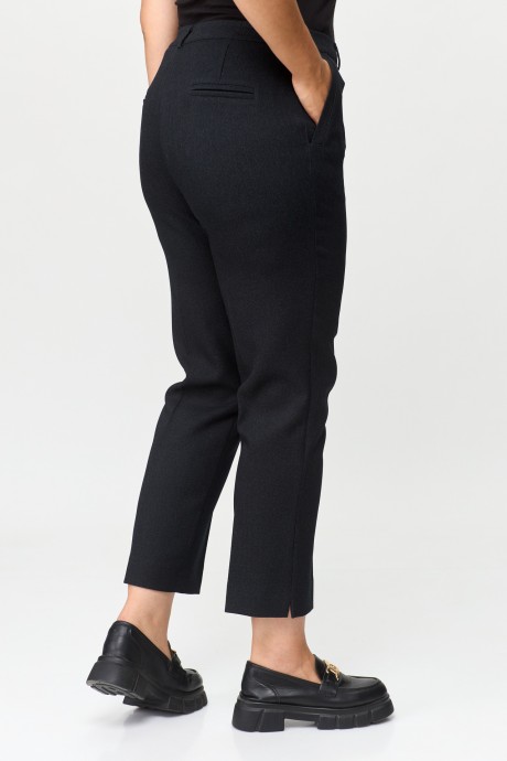 Брюки классические, из плотной текстильной ткани, прямые, слегка заужены к низу, заутюжены стрелки, по переду обработаны карманы с отрезным бочком, застежка на тесьму-молнию и 1 пуговицу. На задних половинках обработаны вытачки и имитация карманов в рамку с двумя обтачками, пояс в брюках притачной, с резинкой. По низу брюк в боковом шве есть небольшой разрез.