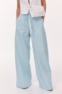 Брюки льняные, немного расширенные к низу, на притачном, отстроченном поясе на резинке. Вверху по переду имитация застежки-гульфик. С карманами в боковых швах.