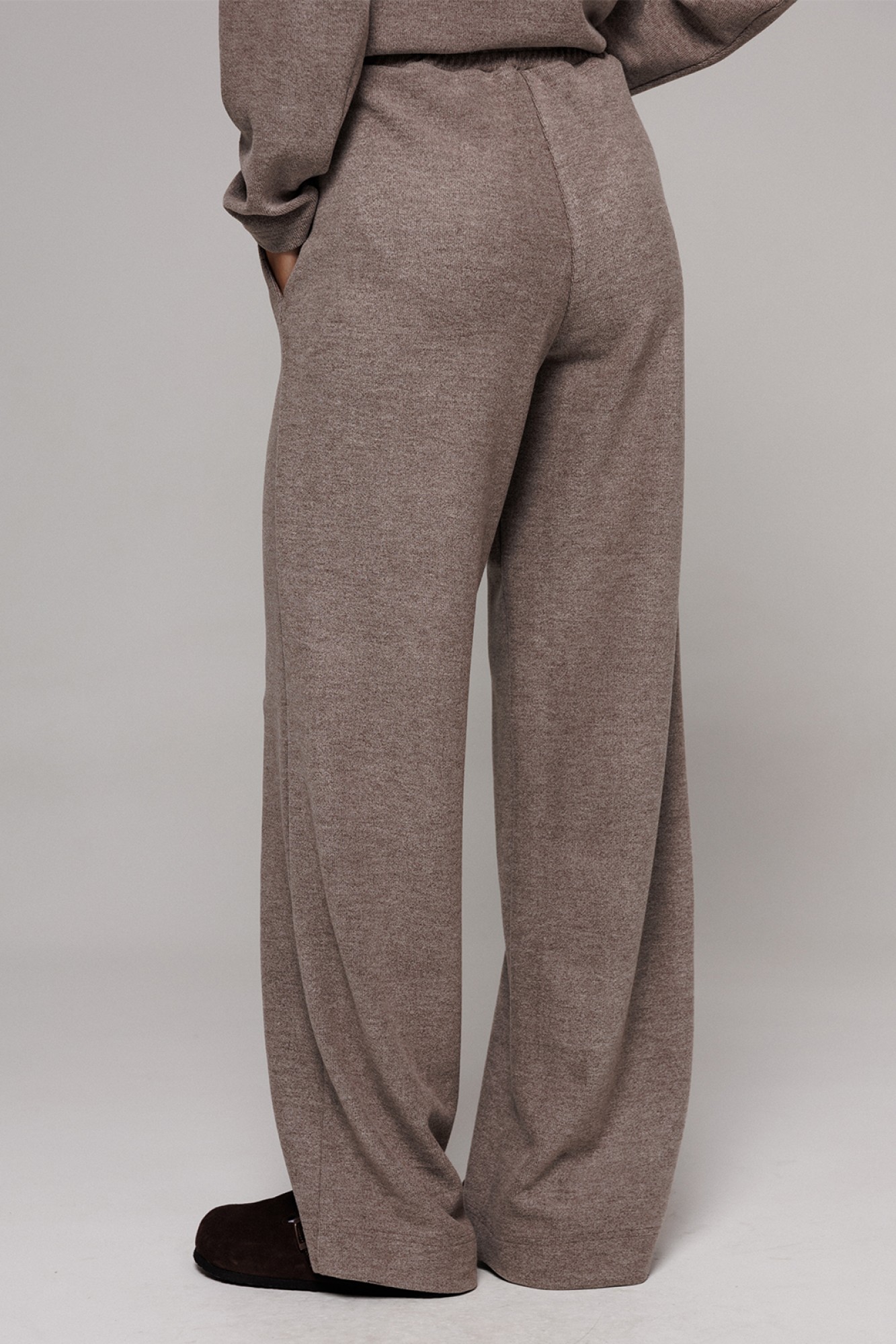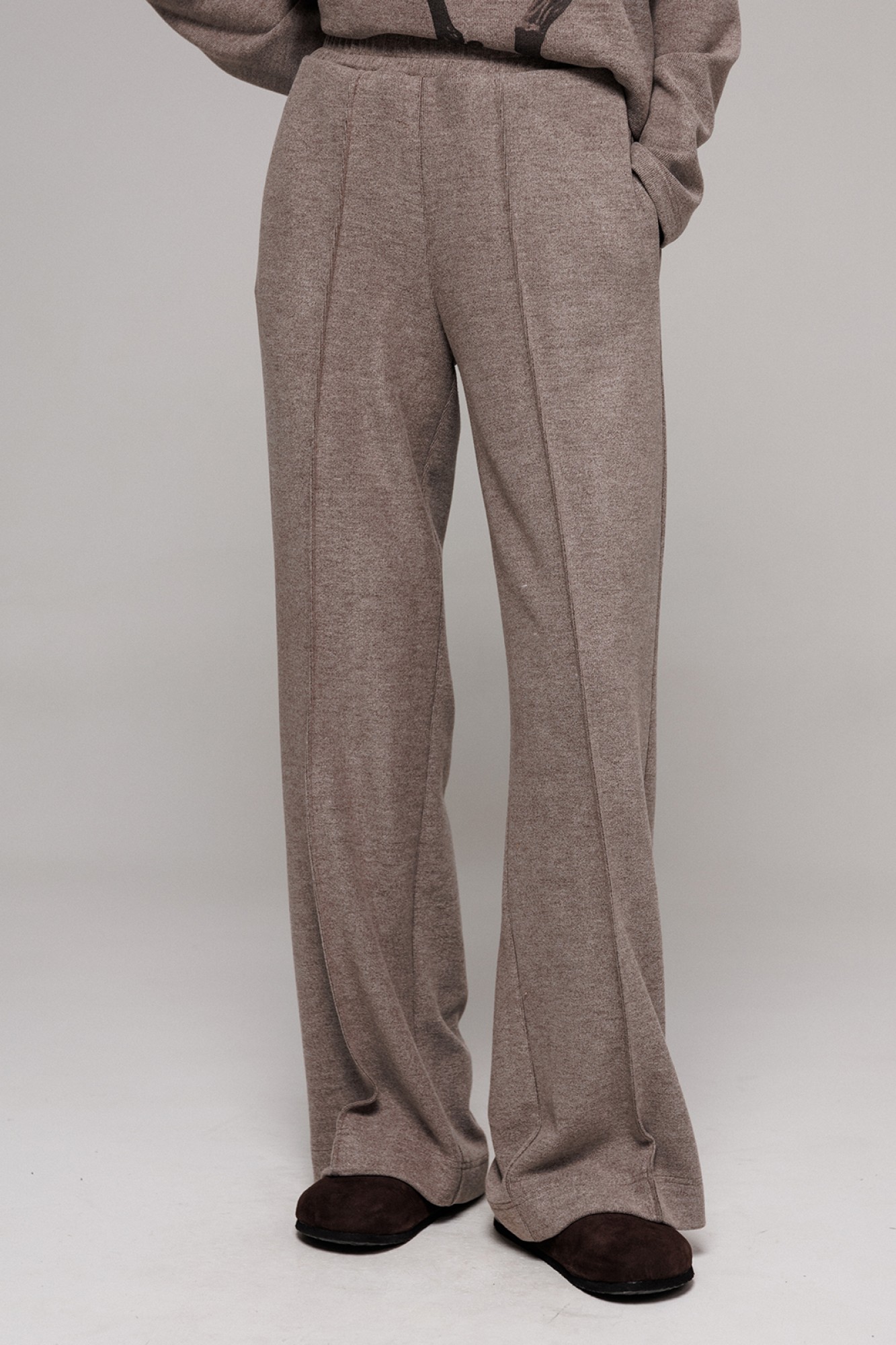 Брюки из трикотажного полотна с велюровым эффектом прямого силуэта на притачном, отстроченном поясе со вставленной в него резинкой. Полочка с защипами от пояса до низа брюк. Брюки с карманами в боковых швах.