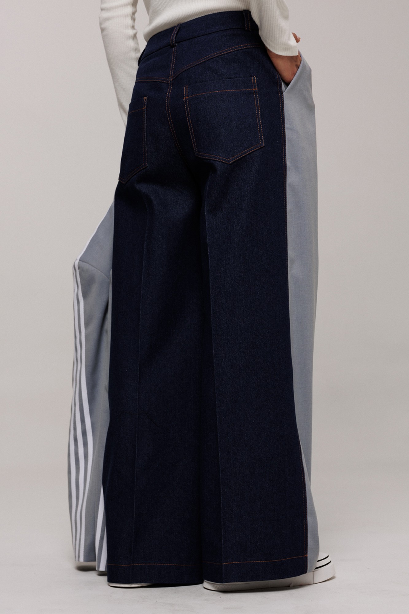 Брюки-палаццо, комбинированные из костюмной ткани по переду и джинса по спинке. Брюки на притачном поясе со шлевками и застежкой-гульфик. Пояс застегивается на петлю-пуговицу. По переду со складками и заутюженной стрелкой от одной из складок по всей длине брюк и карманами в боковых швах с наклонным входом. По спинке кокетка, накладные карманы и заутюженная стрелка.