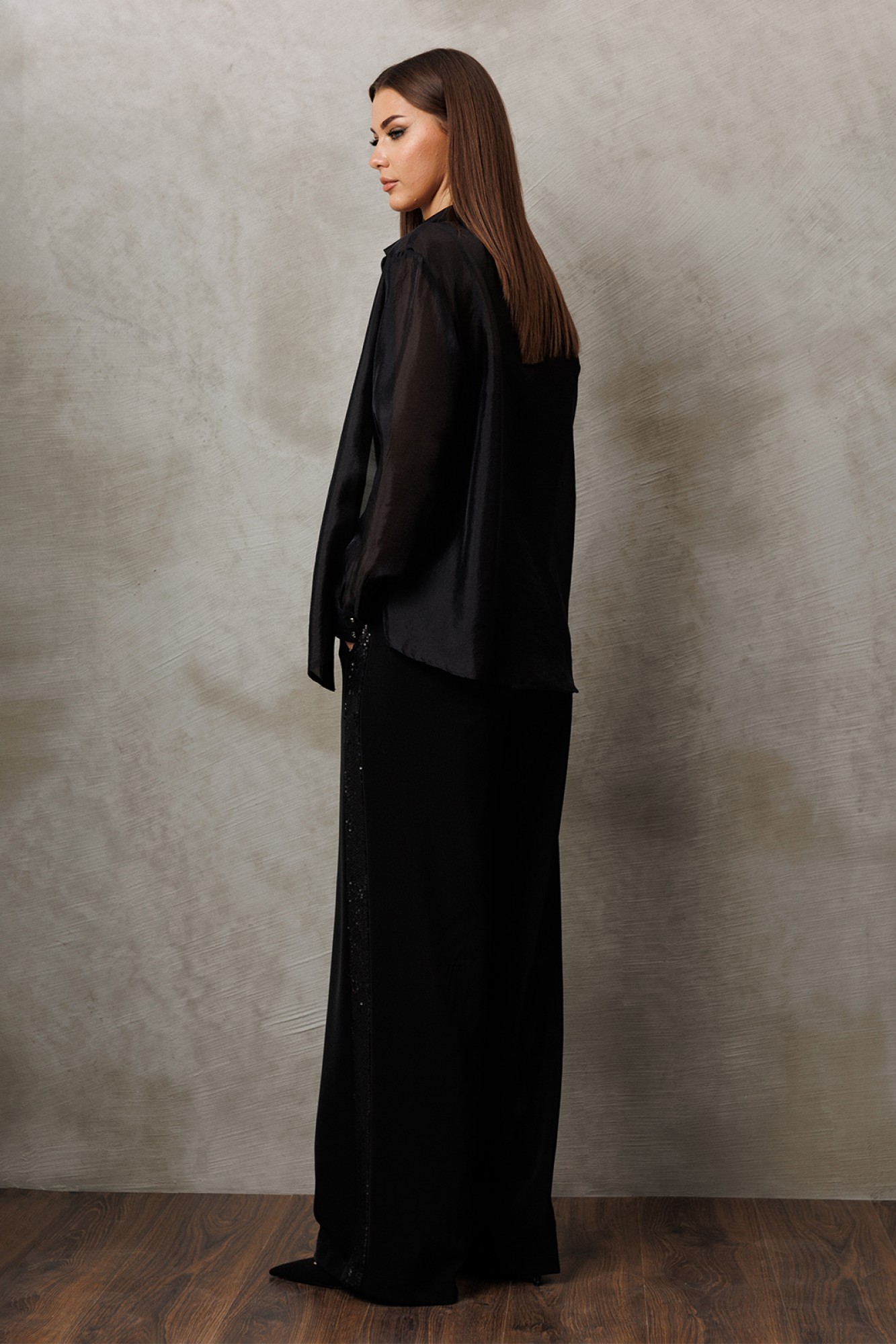 Брюки-палаццо из костюмной ткани с лампасом из пайеток. Брюки на притачном поясе и застежкой-гульфик. Пояс застегивается на петлю-пуговицу. По переду карман в шве притачивания к лампасу. По спинке пояс на резинке и вытачка от пояса.