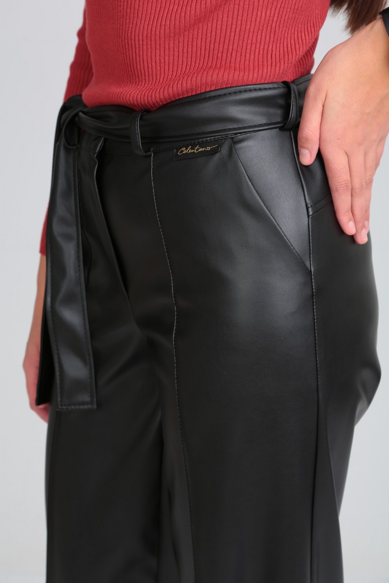 Стильные широкие брюки от Celentano из экокожи. По передним половинкам подрез чуть выше колена, по бокам обработаны карманы. Пояс притачной, застежка на кнопку и гульфик с молнией. По задним половинкам брюк обработана кокетка. Брюки спереди со стрелками.