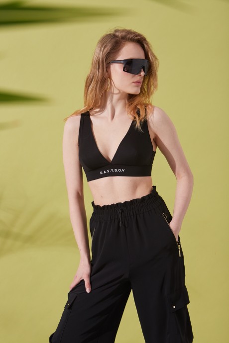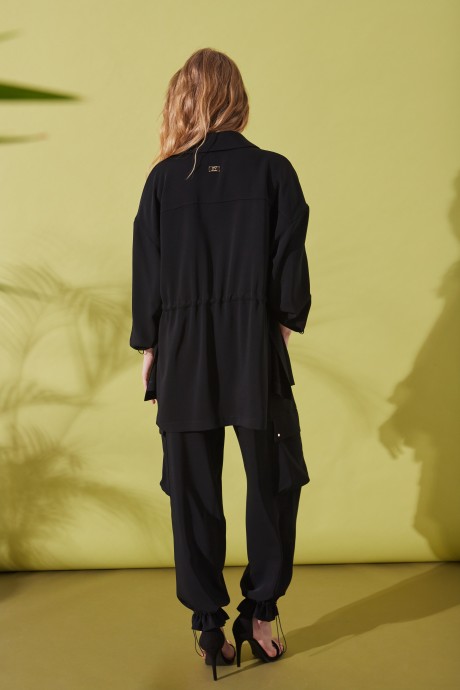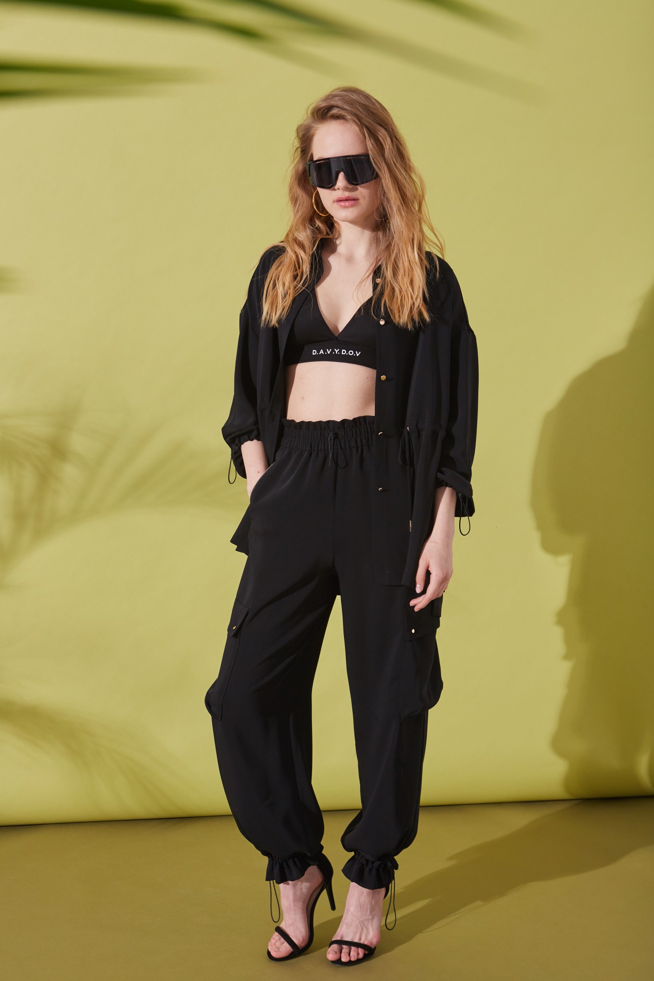 Брюки из струящейся костюмно-плательной ткани свободного кроя, с посадкой на талии, длиной до щиколотки, с напуском по низу. Передние половинки с функциональными карманами, на уровне бёдер, с застёжкой на металлические молнии. На уровне колена по центру бокового шва, настрочены прямоугольные карманы- портфели с прямоугольными клапанами и застёжкой на петли и пуговицы в углах клапанов. Пояс притачной с эластичной тесьмой и эластичным шнурком с фиксатором по центру переда, верхний срез пояса с мягкой оборкой. Низ брюк собирается эластичным шнуром, протянутым через кулису выше линии подгибки, формируя мягкую оборку. Сборка низа регулируется фиксаторами.