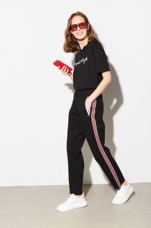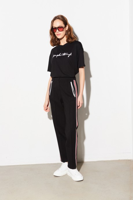 Брюки из трикотажного полотна средней плотности, с посадкой на талии, длиной до щиколотки, слегка заужены к низу. Передние половинки с вертикальными карманами с контрастной молнией, с застёжкой на молнию в среднем шве, по центру застрочены канты, задние половинки без особенностей. На боковые швы настрочена широкая отделочная тесьма. Пояс с застёжкой на петлю и пуговицу по центру переда и эластичной тесьмой на участке спинки.
