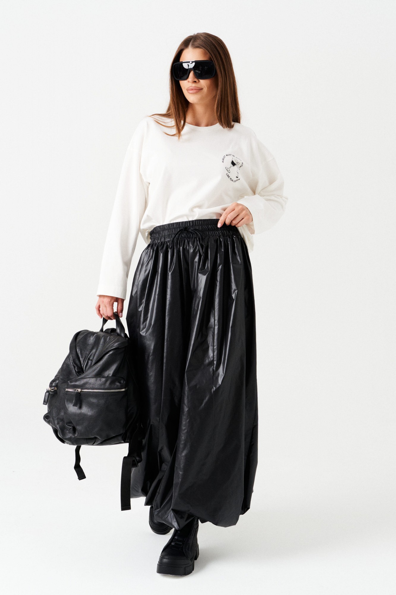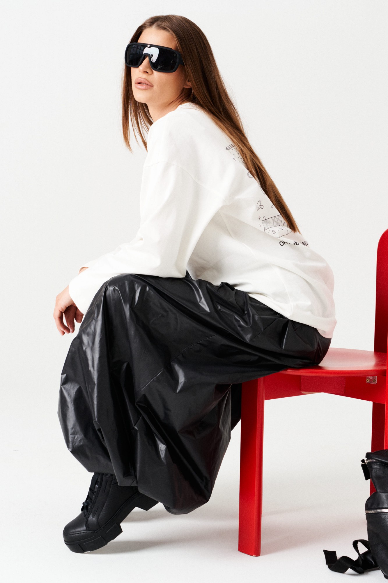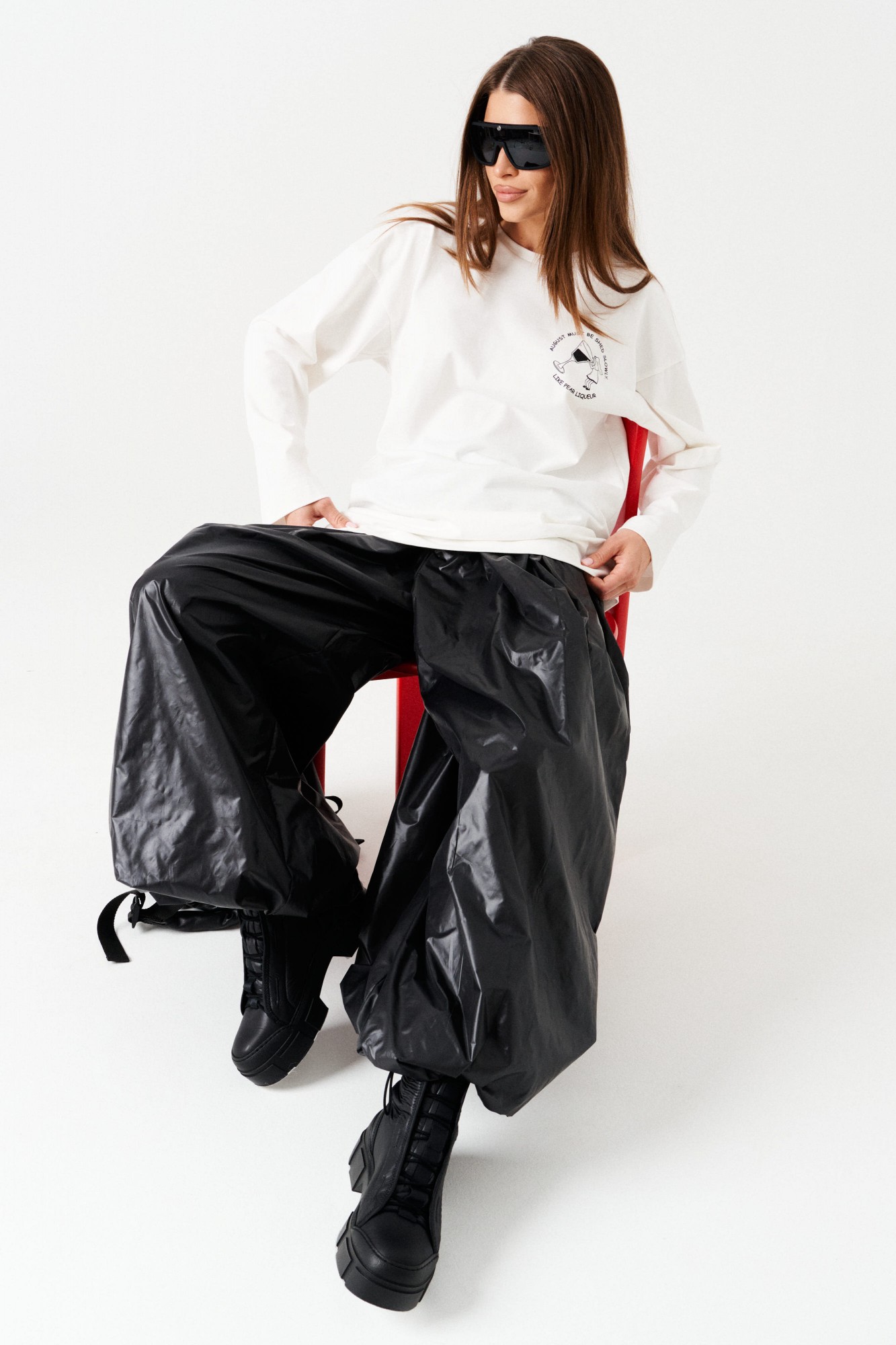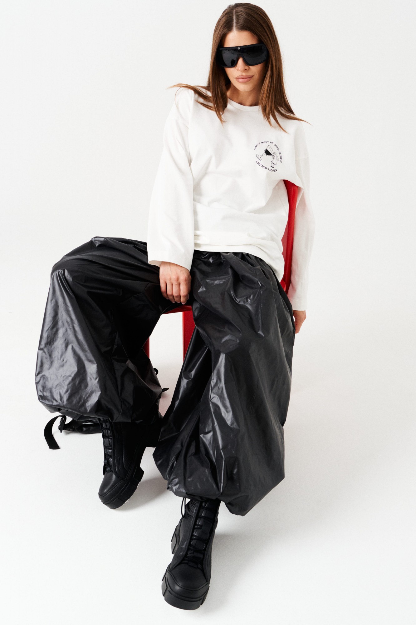 Брюки-джоггеры большого объема, со сборкой по верхнему и нижнему срезу, на притачной подкладке. Пояс на резинке с отделочными строчками, образующими кулису, в которую вставлен шнур-завязка. Низ брюк с сборкой на резинку. В боковых швах расположены карманы.
