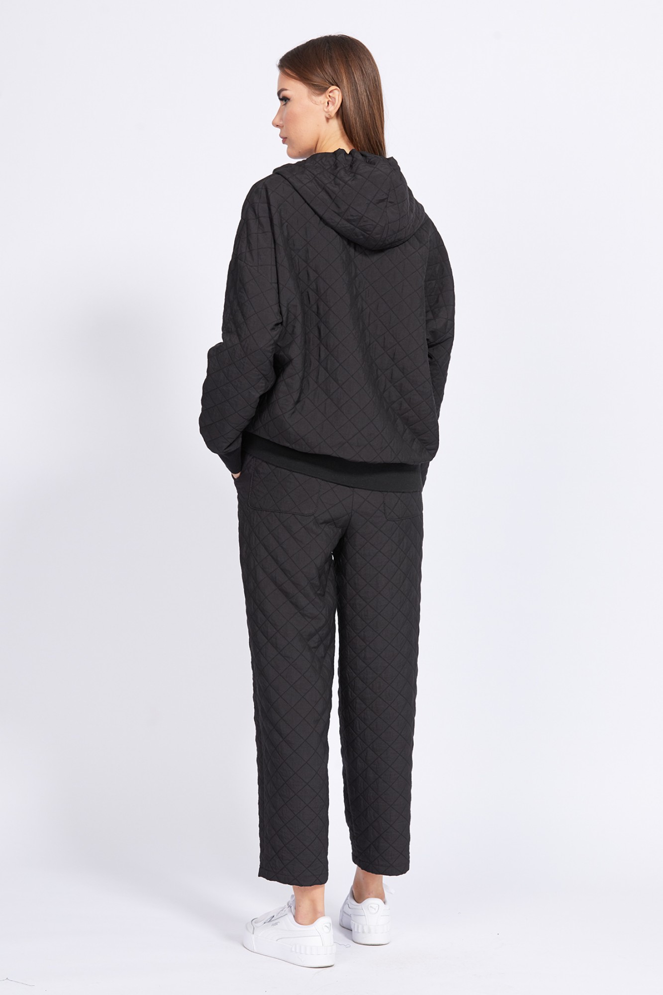 Брюки выполнены из костюмно-плательной ткани имитирующей стежку. Брюки О-образного силуэта (покроя ""багги""), на притачном поясе, зауженные к низу, длиной 7/8. Спереди декоративная застежка с гульфиком и боковые карманы с наклонным входом. На задних частях накладные карманы. По талии вставлена эластичная тесьма и шнур.