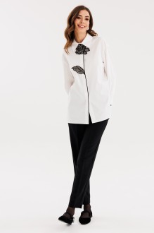 Брюки выполнены из однотонной костюмной ткани, заужены к низу, на задних половинках карманы с листочкой, застежка в боковом шве на металлическую молнию и пуговицу. По низу в боковом шве разрезы.