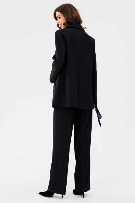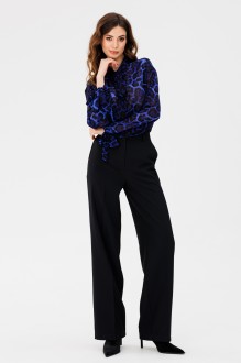 Брюки выполнены из костюмной ткани. Брюки прямого покроя, на притачном поясе, длиной в пол. Спереди застежка на молнию с гульфиком, потайную пуговицу и брючный крючок. Карманы боковые с наклонным входом. Передние и задние части брюк заутюжены на кант.