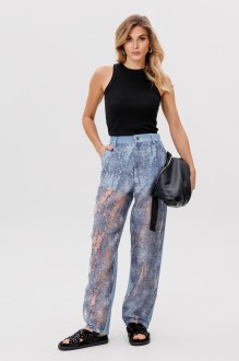 Брюки выполнены из джинса с отделкой по переду из органзы. Брюки свободного покроя на притачном поясе. Спереди боковые карманы с фигурным входом и застежка на молнию. На задних частях кокетки и накладные карманы. Пояс застегивается на одну пуговицу.