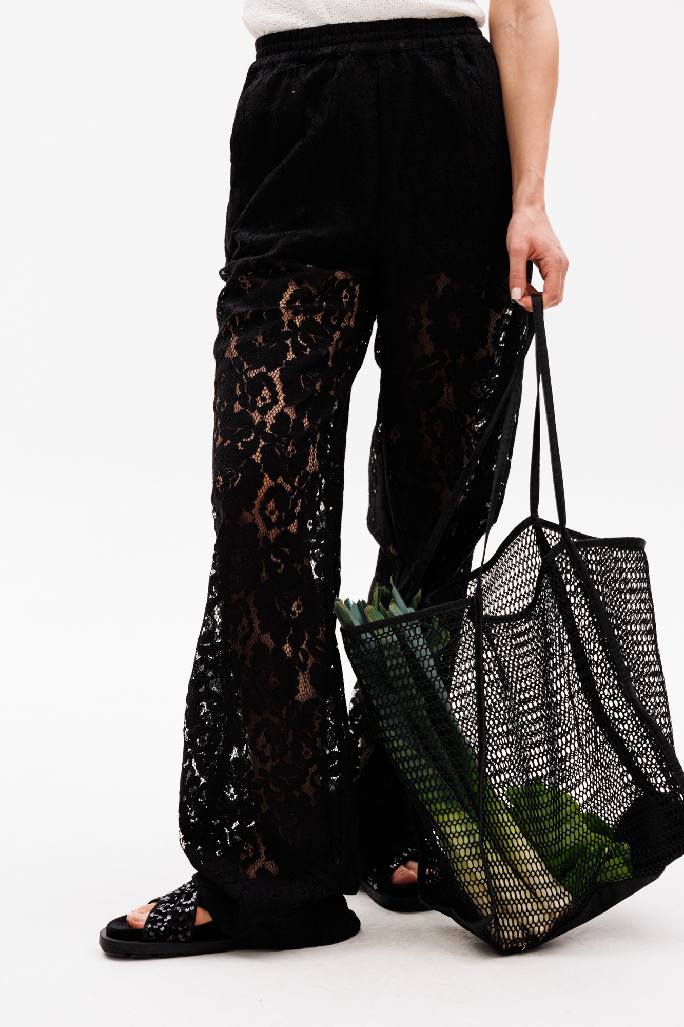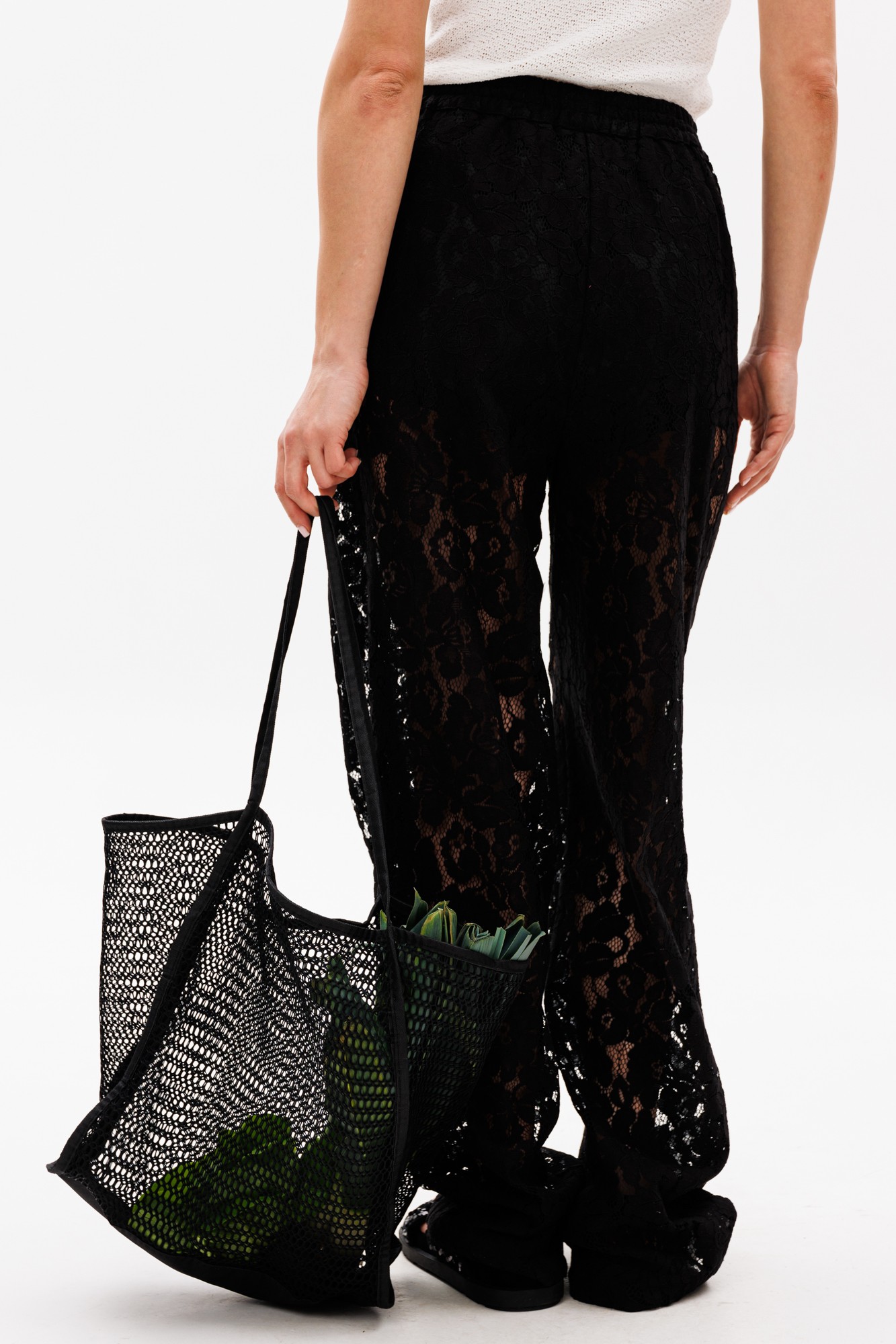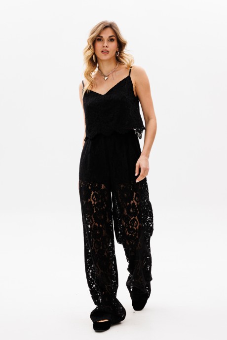 Брюки выполнены из гипюра. Брюки прямого силуэта на притачном поясе с эластичной тесьмой. В боковых швах карманы с наклонным входом. Брюки на отлетной подкладке в виде шорт.