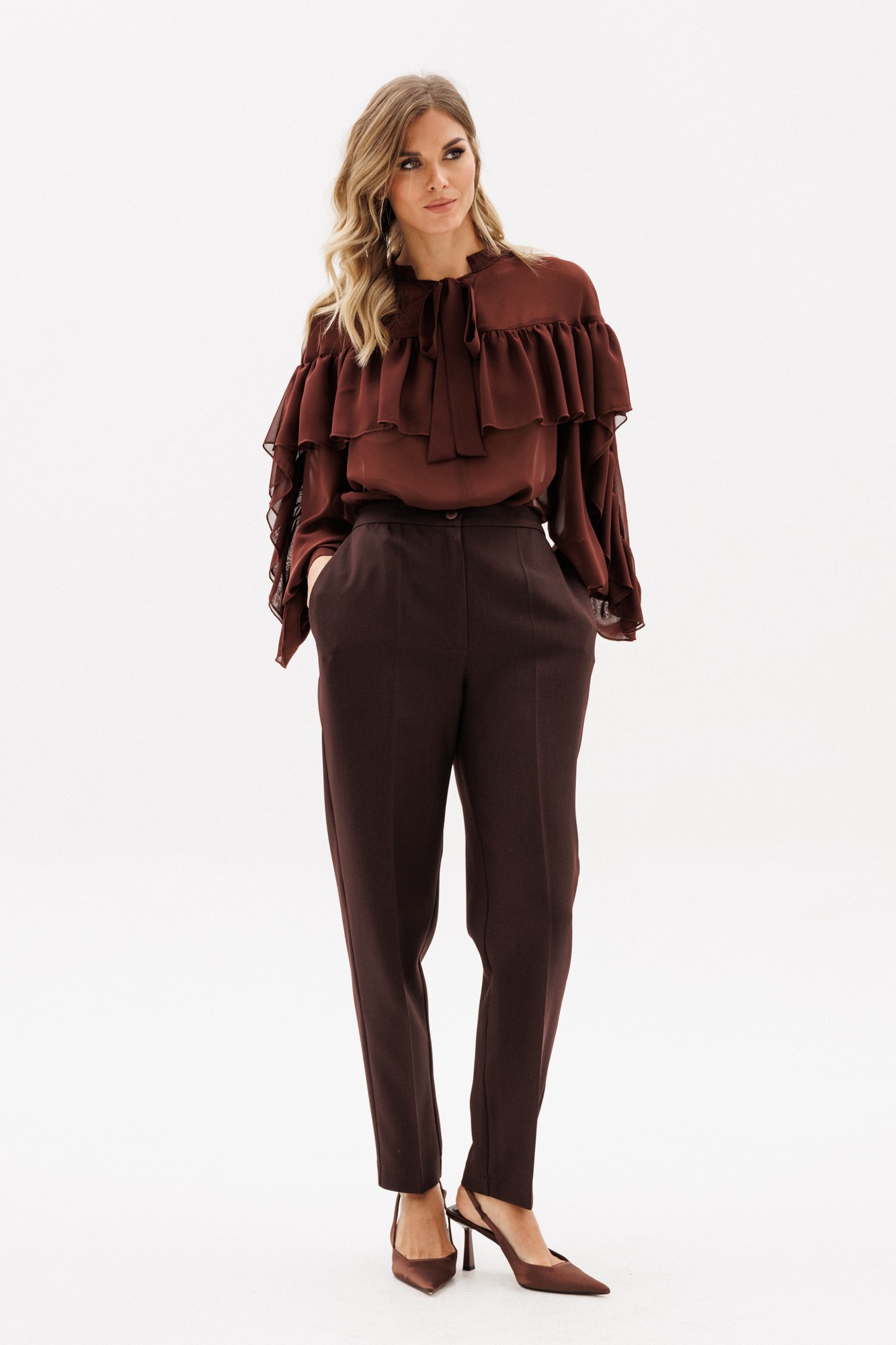 Брюки выполнены из костюмной ткани. Брюки заужены к низу, длиной 7/8, на притачном поясе. Спереди боковые карманы с наклонным входом и застежка на пуговицу и молнию. Сзади таллиевые вытачки и декоративные прорезные карманы. По задней части пояса эластичная тесьма.