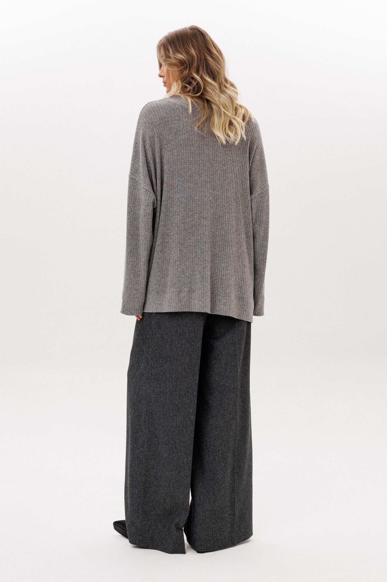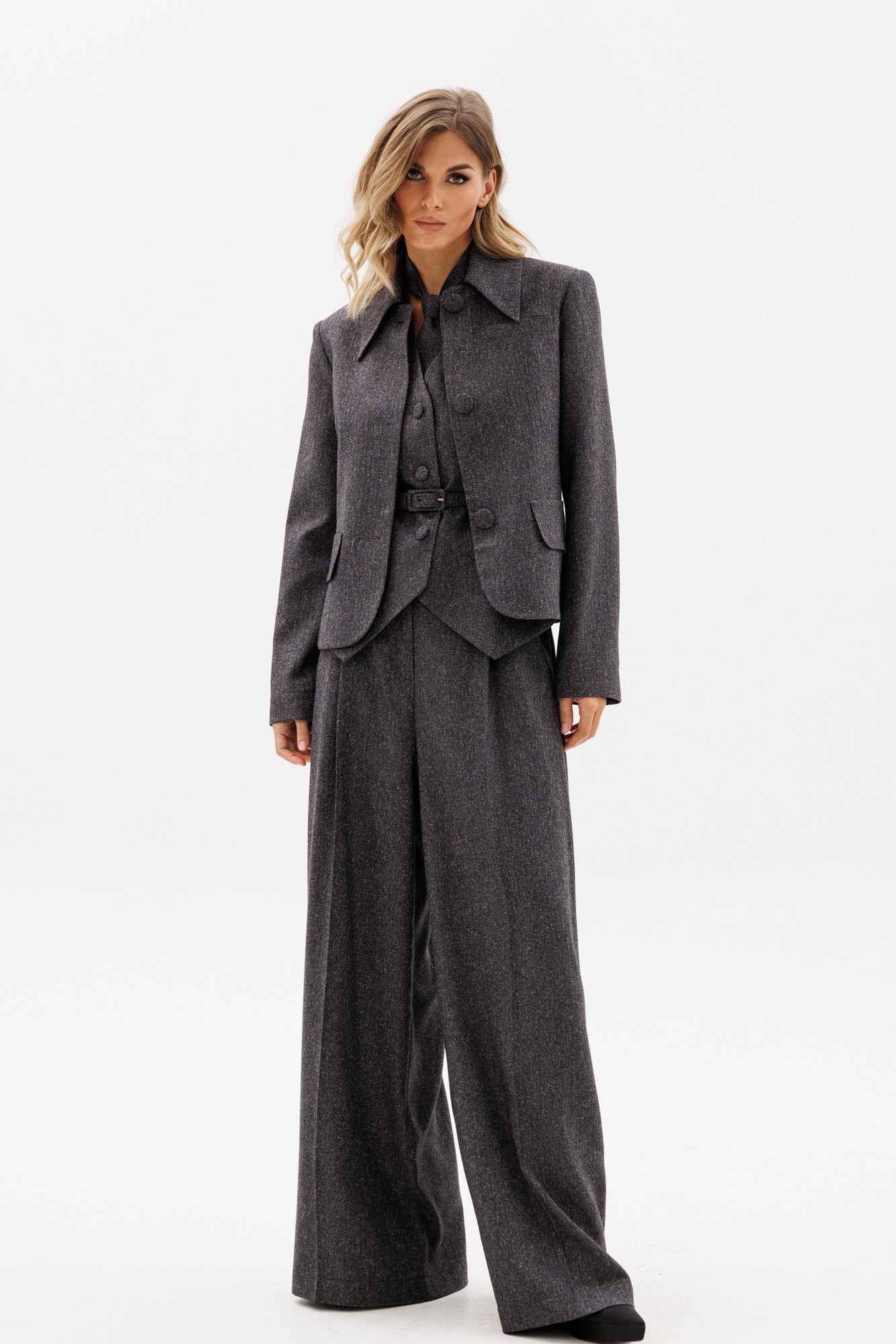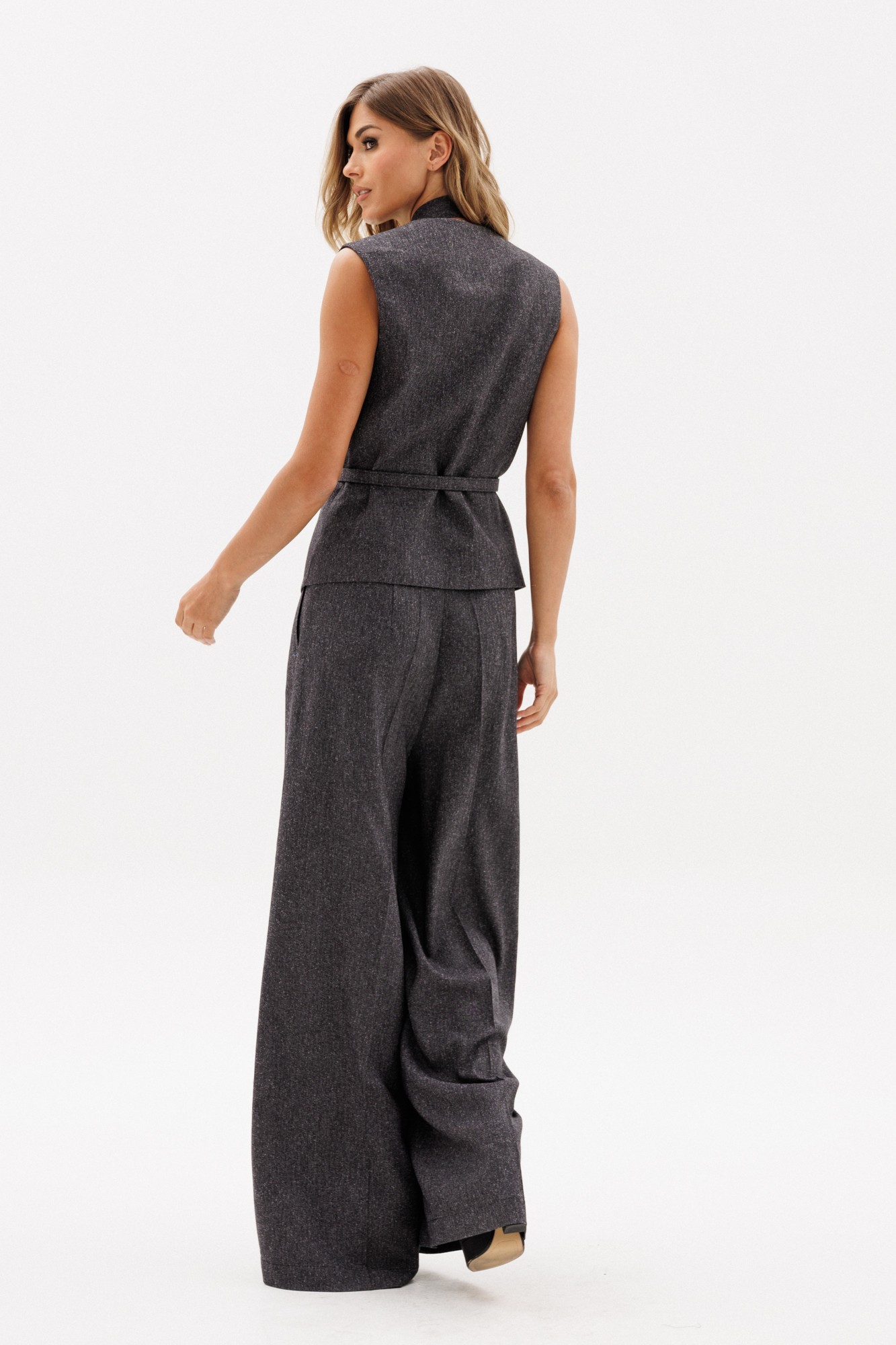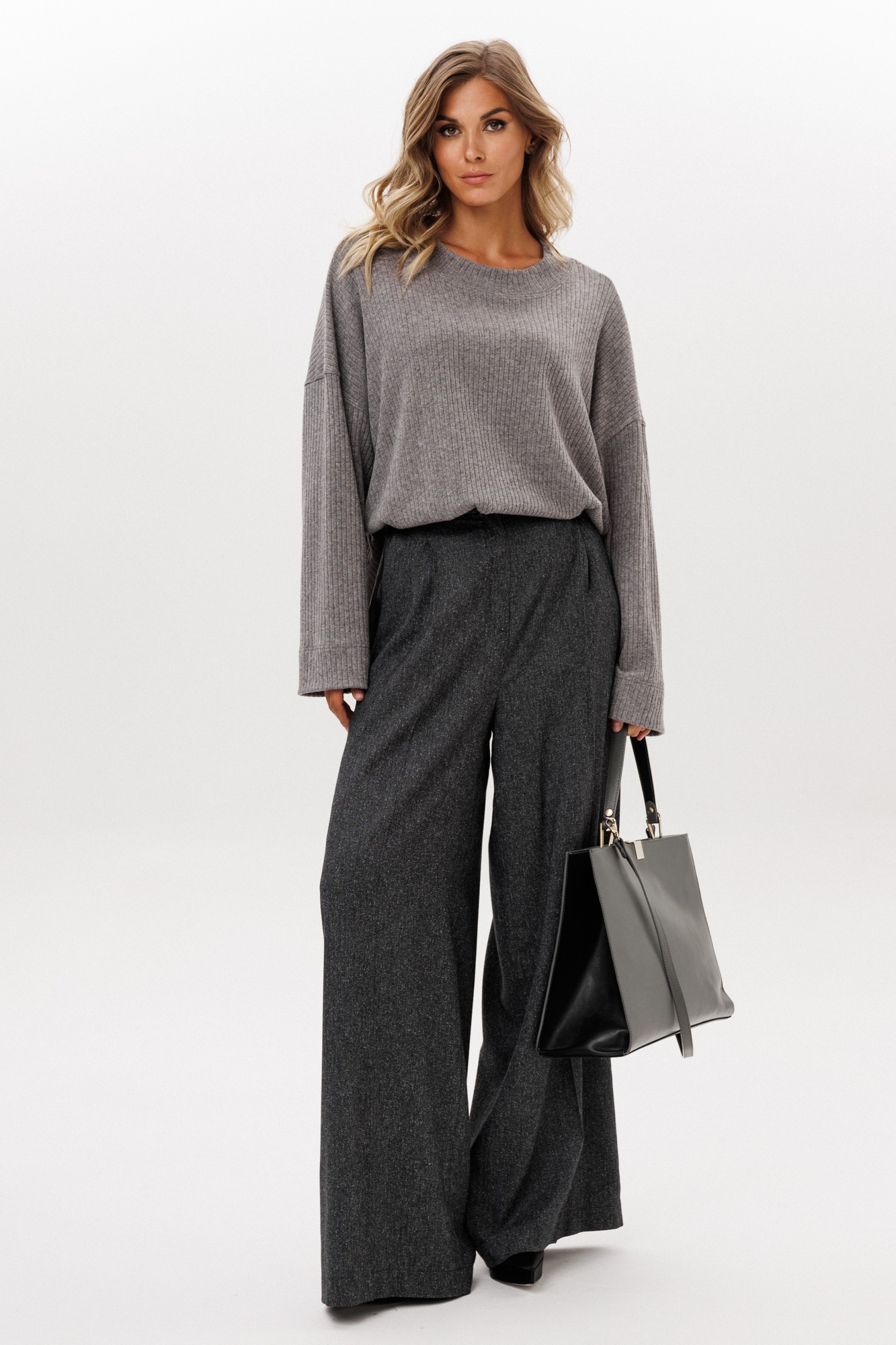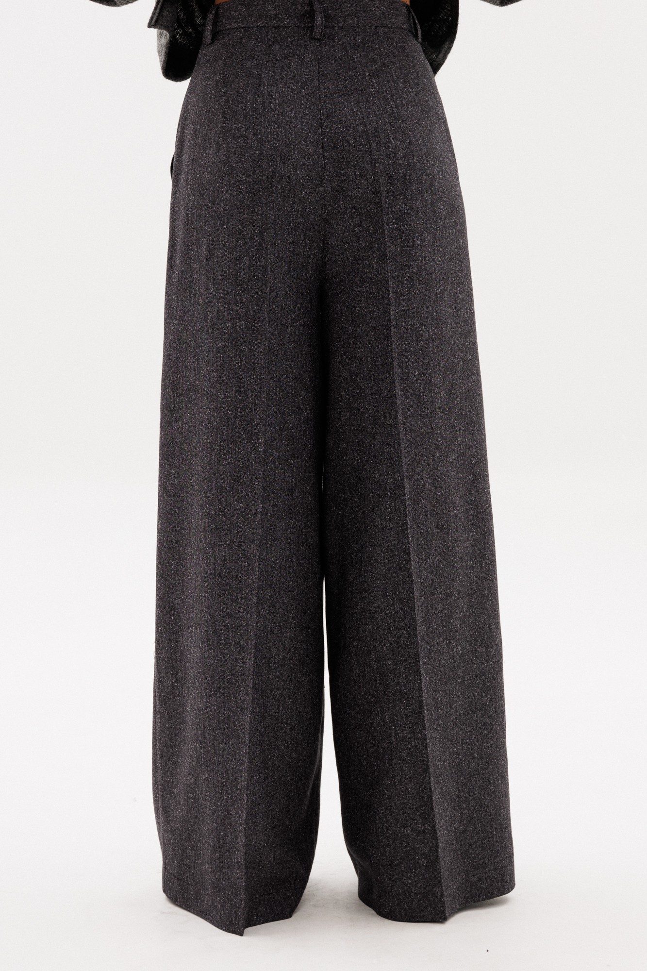 Брюки-палаццо выполнены из костюмной ткани меланж. Брюки на притачном поясе, длиной в пол, расширенные к низу. Спереди складки и боковые карманы с наклонным входом. Застежка спереди на молнию с гульфиком и пуговицу. На задних частях обработаны таллиевые вытачки.