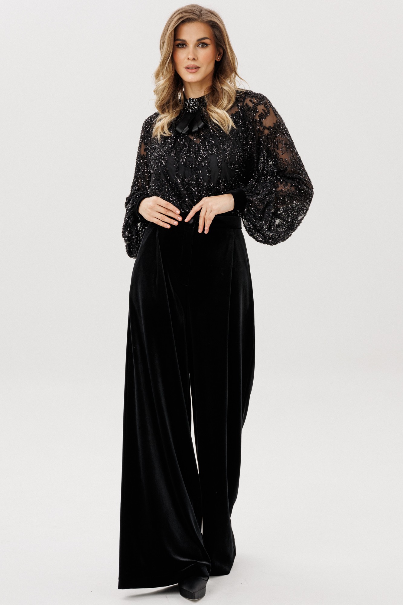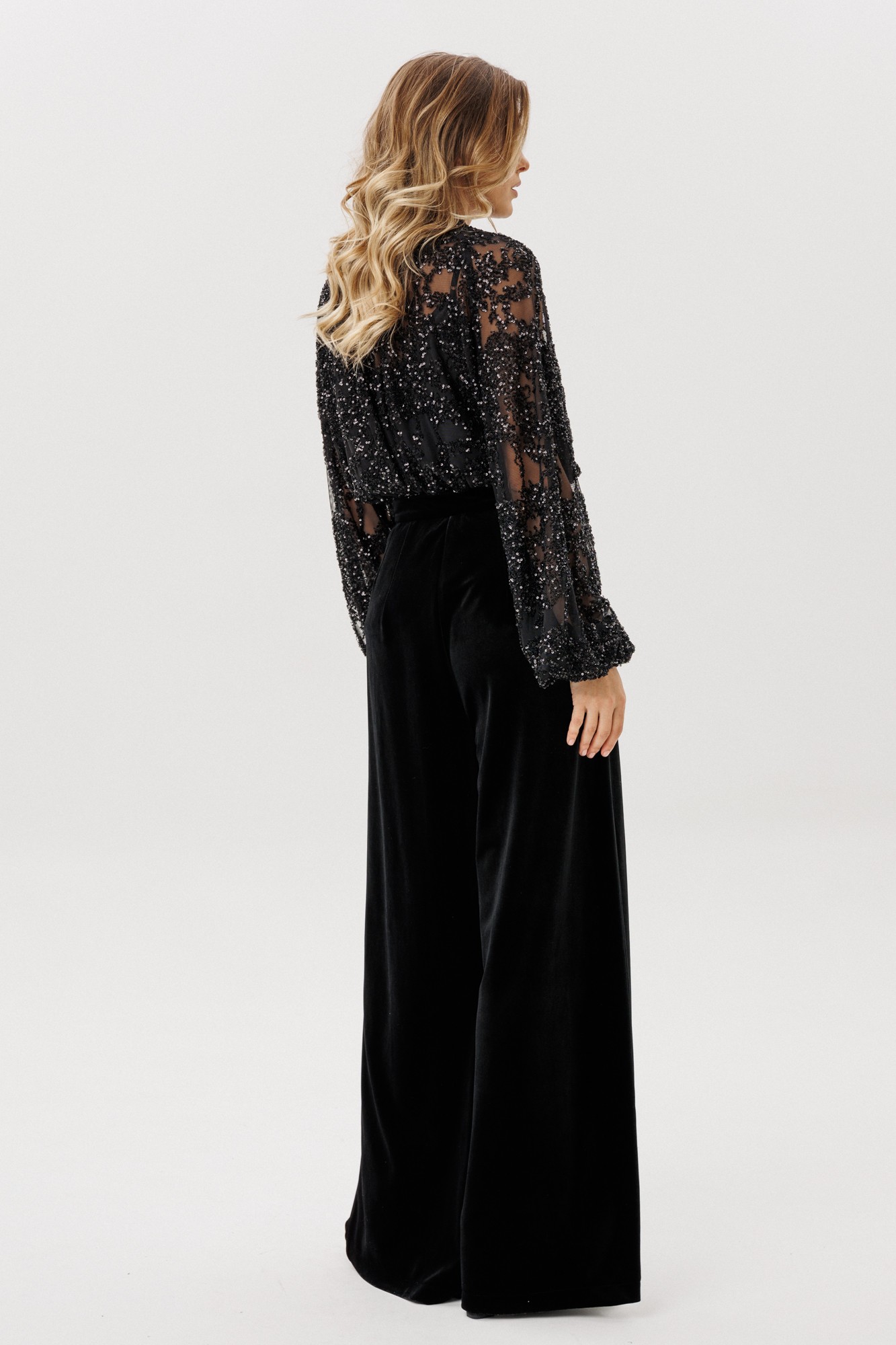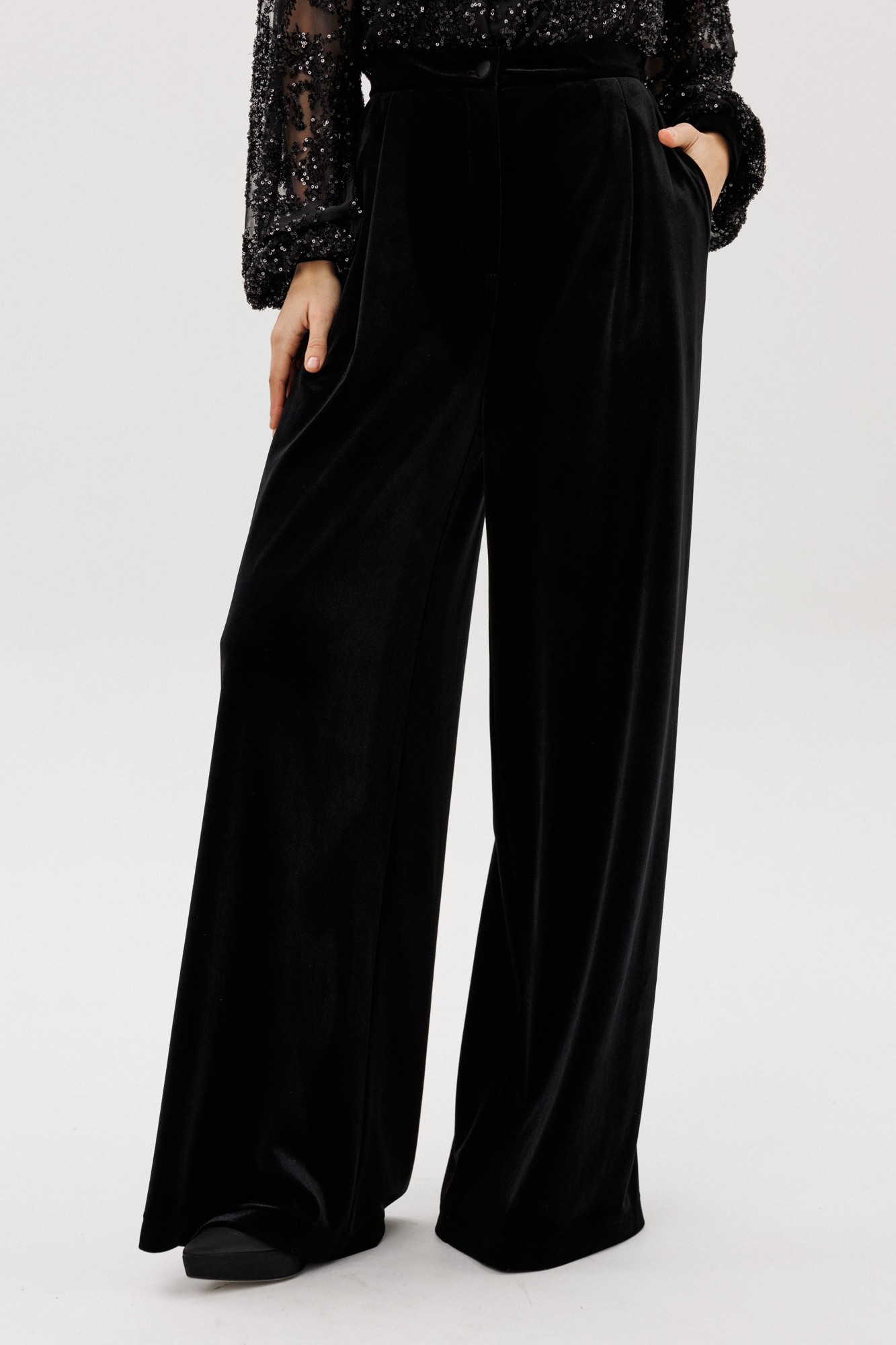 Брюки-палаццо выполнены из бархата. Брюки на притачном поясе, длиной в пол, расширенные к низу. Спереди складки и боковые карманы с наклонным входом. Застежка спереди на молнию с гульфиком и пуговицу. На задних частях обработаны талиевые вытачки.