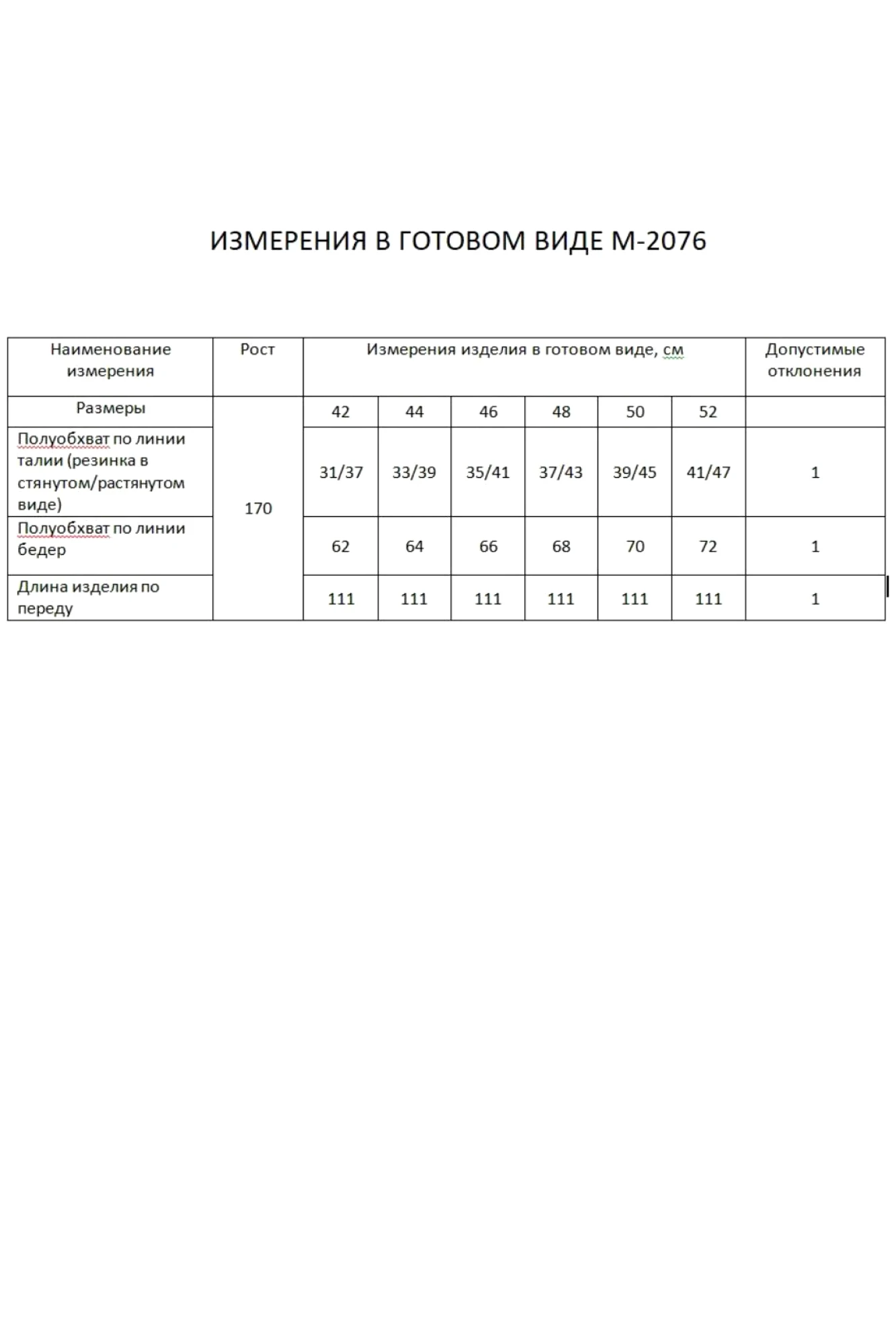 Таблица размеров