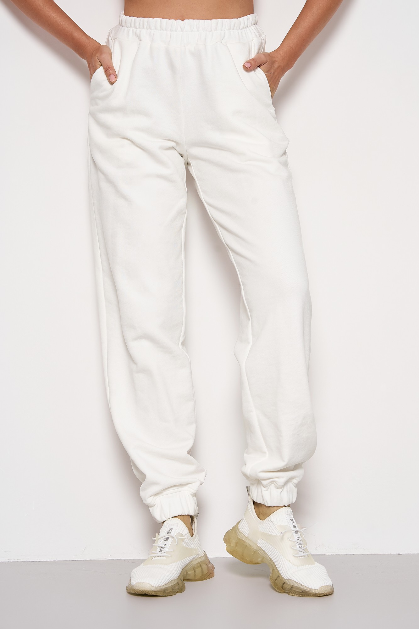 Женские брюки (спортивные штаны) свободного силуэта с функциональными карманами в боковых швах заужены к низу, пояс брюк и отрезные манжеты по низу полностью на резинке. Брюки выполнены из высококачественного футера 3-х нитки класса "пенье". Лицевая сторона ткани гладкая, изнанка - петлеобразная