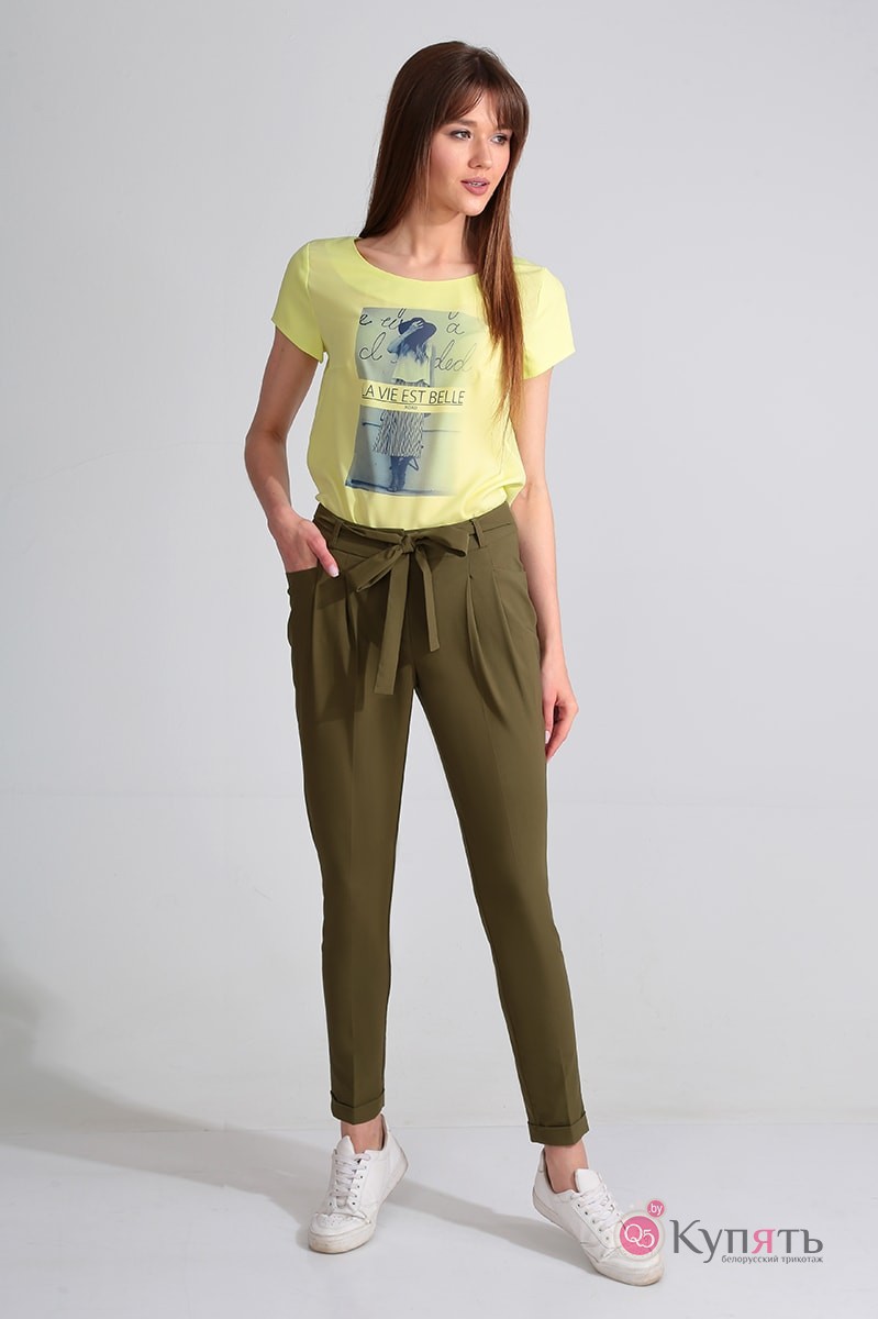 Комплектация: брюки. Описание внешнего вида: брюки с отрезным поясом, шестью шлевками-две на передней половинке, четыре на задней. Застежка-гульфик, пояс на одну петлю и пуговицу. Передние половинки с двумя односторонними складками по шву притачивания пояса. На передних половинках-карманы, входящие в боковой шов. Задние половинки с талиевыми вытачками, двумя накладными карманами. Брюки с цельнокроенными манжетами по низу. Силуэт: зауженный книзу Цветовая гамма для верха, подкладки, фурнитуры, отделки: брюки из эластичной ткани, в одной цветовой гамме. Обхват по талии: 71-83см (соотв. размеру 42-48)