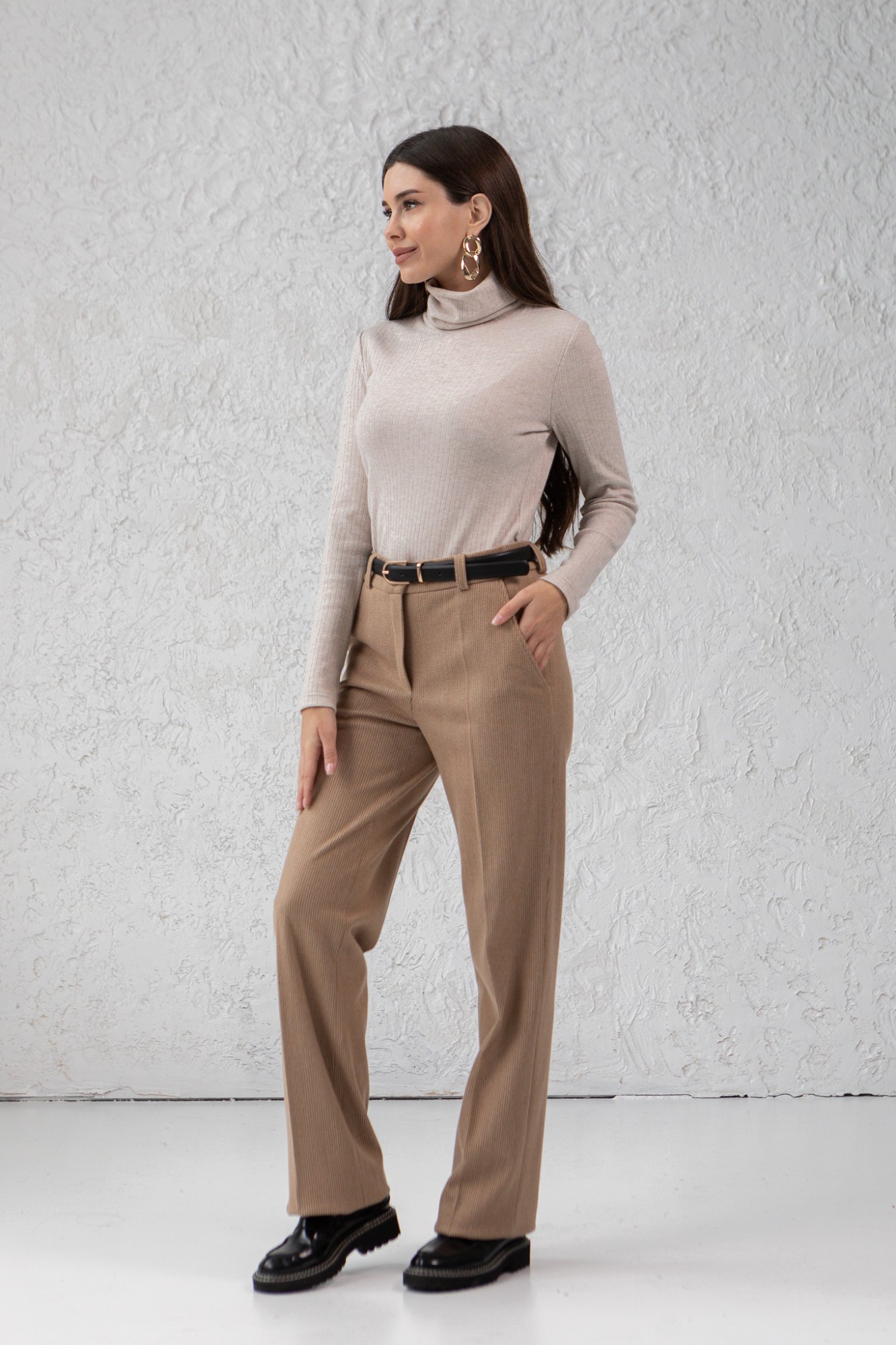 Классические прямые женские брюки в теплом варианте для любой непогоды, пояс сзади на резинке, что позволяет хорошо садиться на любой тип фигуры. Удобная посадка, стильная деловая модель женских брюк для ежедневных образов. Добавив туфли на высоком каблуке и яркую блузку, у вас выйдет модный вариант образа, подходящий на любое торжество.