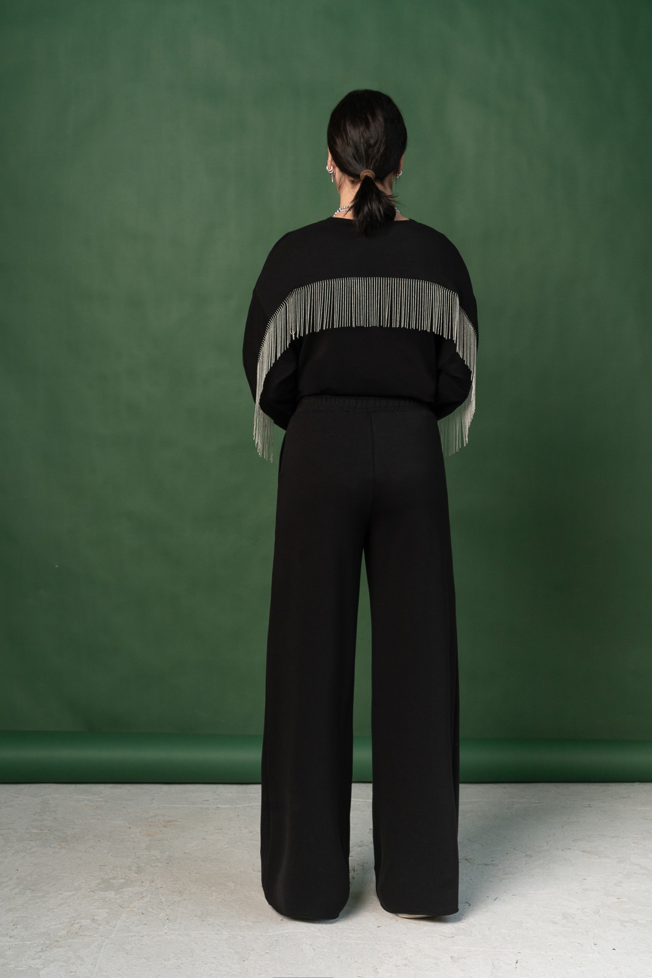Брюки молодежные из трикотажного полотна с активным расширением к линии низа на притачном поясе с эластичной тесьмой и наклонными карманами спереди. Низ брюк с необработанным срезом.