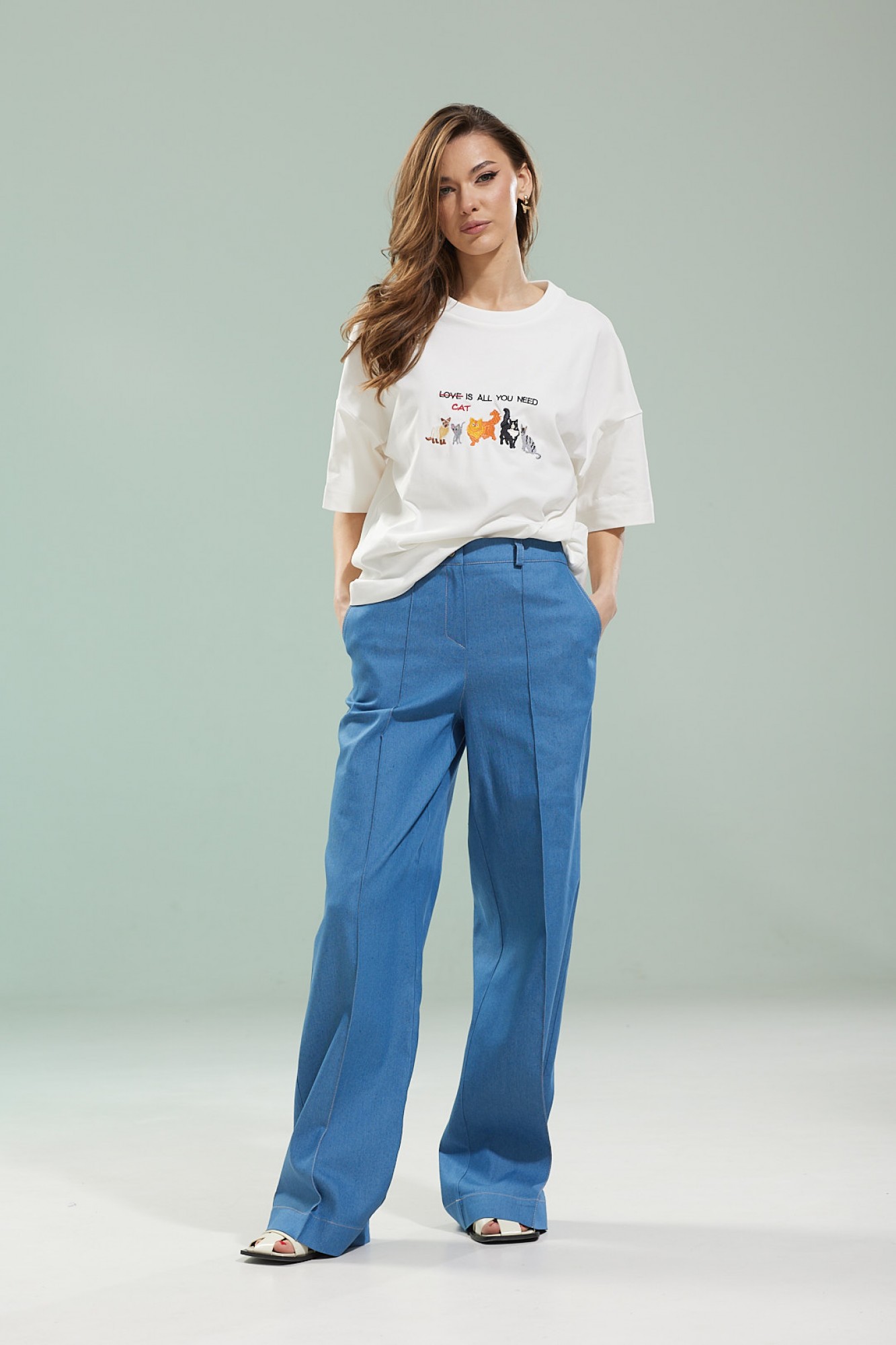 Брюки женские, расширенные. По переду обработана застежка на молнию, обработаны карманы с наклонным входом, застрочены стрелки. На задних половинках брюк застрочены вытачки, настрочены фигурные накладные карманы. Верх обработан широким притачным поясом (частично на резинке) со шлевками, застегивающимся на петлю и пуговицу.
