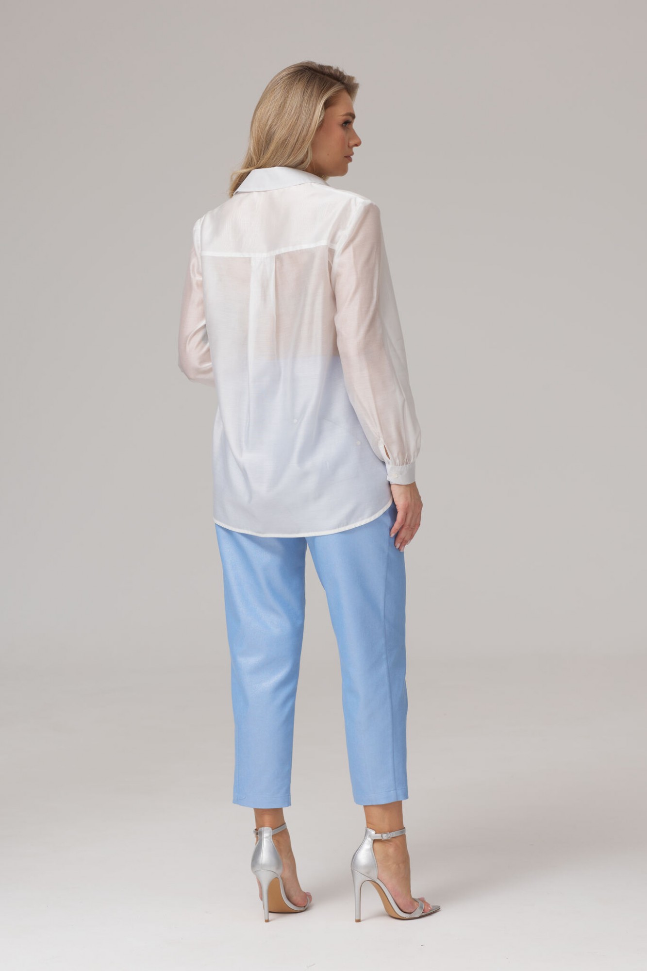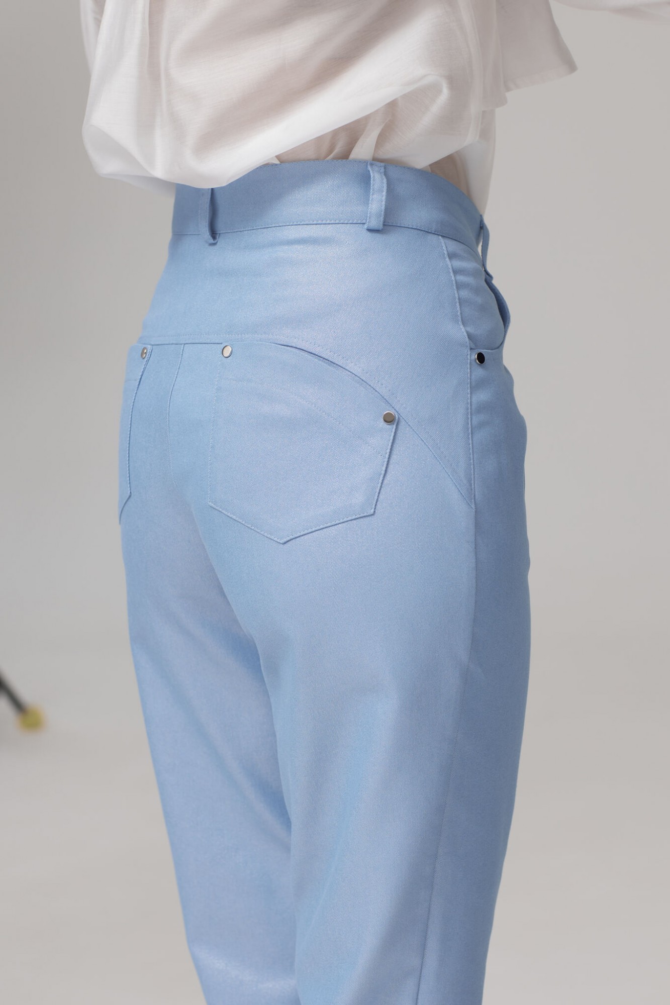 Брюки женские типа «бананы». По переду обработаны фигурные карманы, застежка на молнию, отстрочены складки. Сзади фигурная отстрочная кокетка и фигурные накладные карманы, декорированные металлическими хольнитенами. Верх обработан притачным поясом со шлевками, застегивающимся на кнопку. По низу брюк спереди и сзади отстрочены вытачки. Декоративные элементы и фурнитура могут отличаться от заявленных на фото. Цвет материала может отличаться по тону в зависимости от настроек вашего монитора!