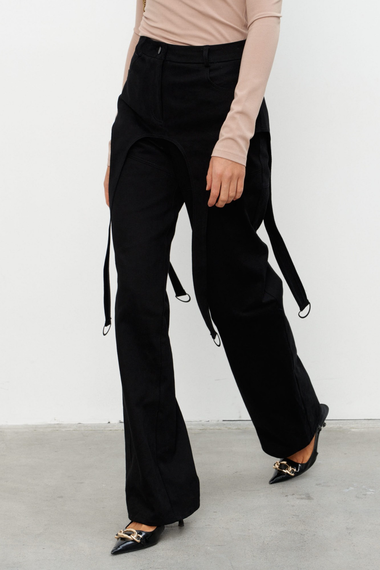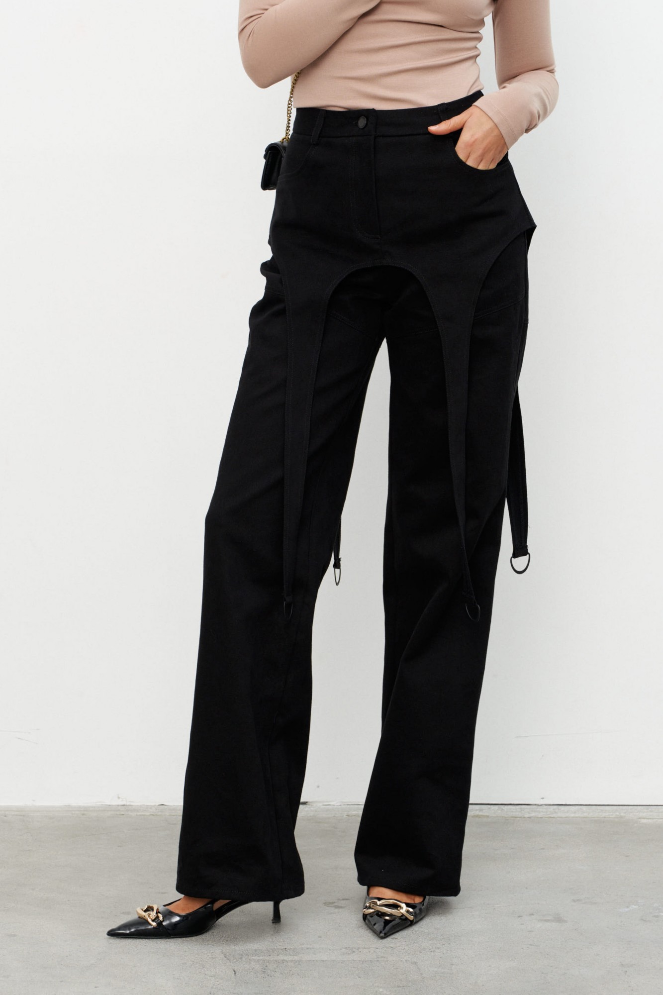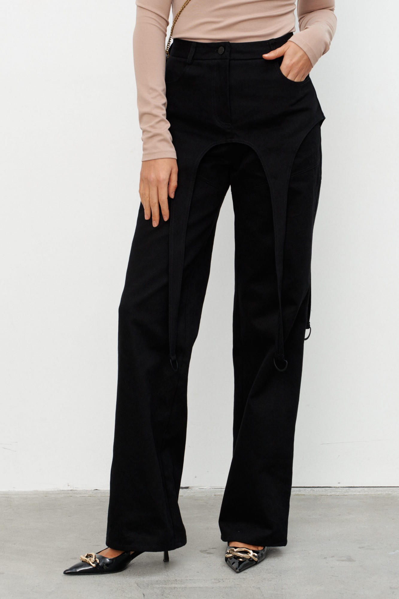 Брюки прямого силуэта из плотного джинса с баской. Брюки на поясе со шлёвками и застёжкой на пуговицу-болт и молнию. Чуть ниже шва сидения идут подрезы имитирующие по форме мини-шорты. По переду два прорезных кармана, по спинке - два накладных.