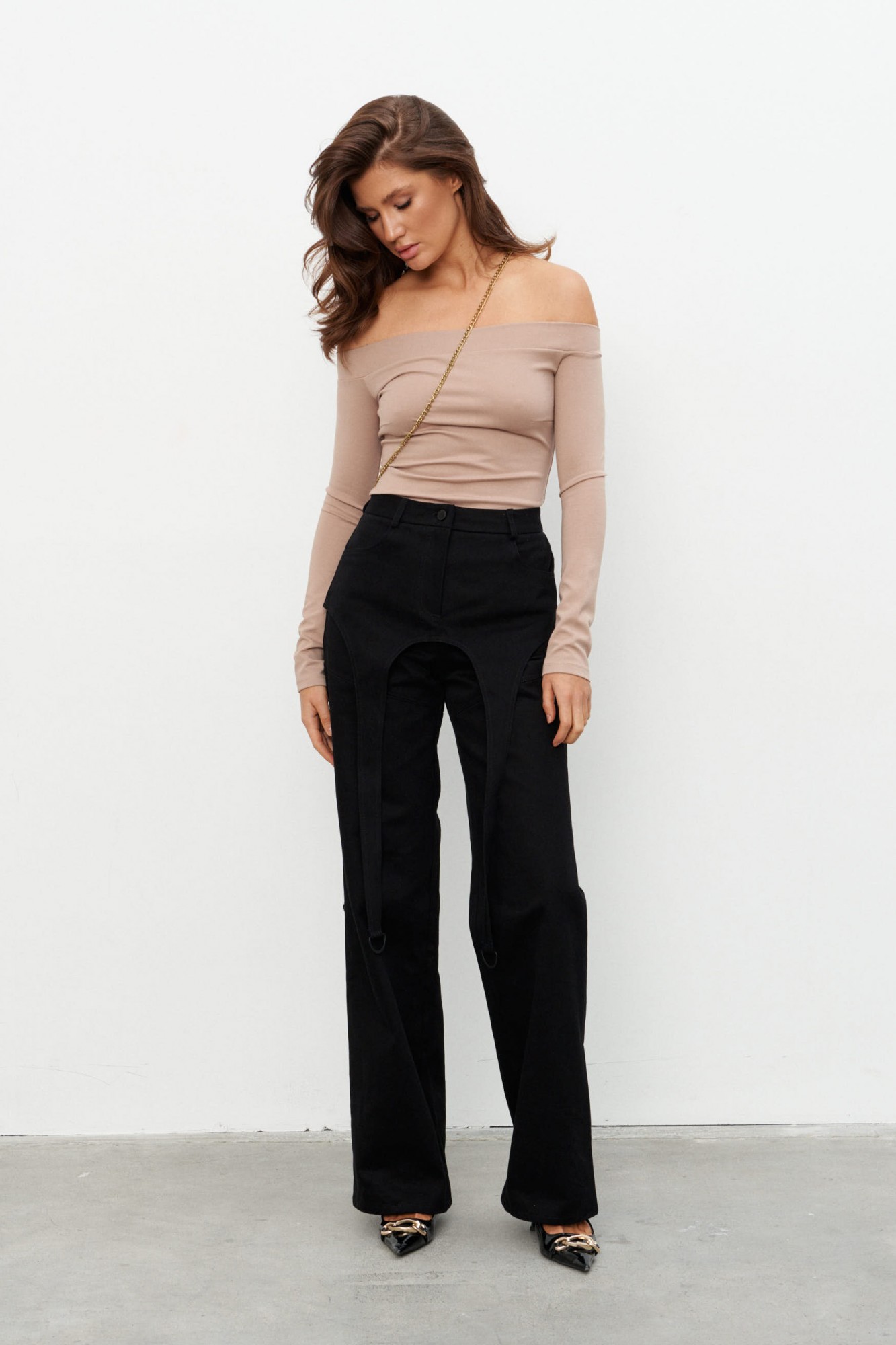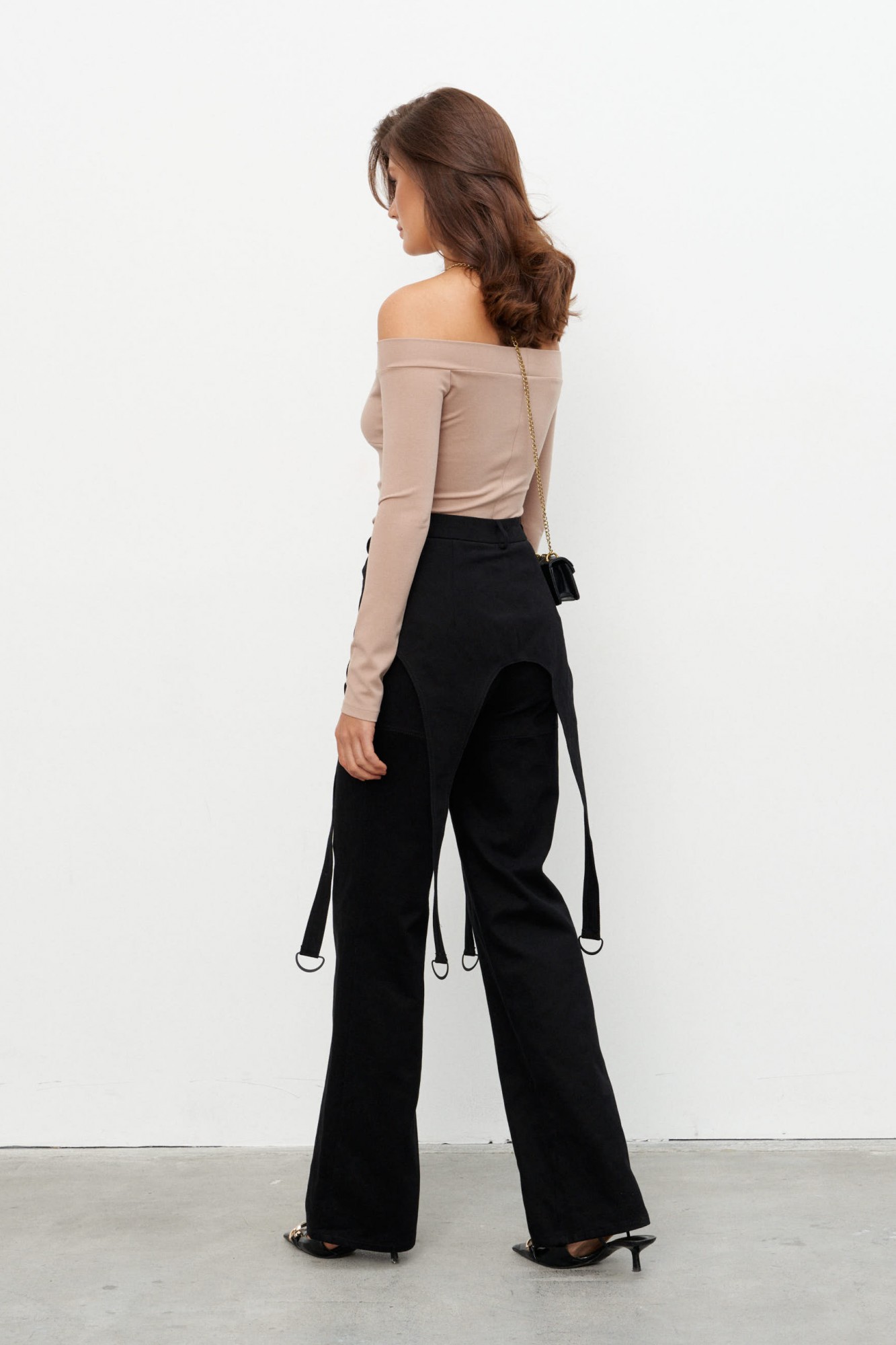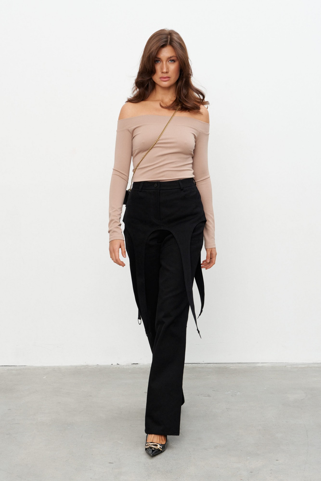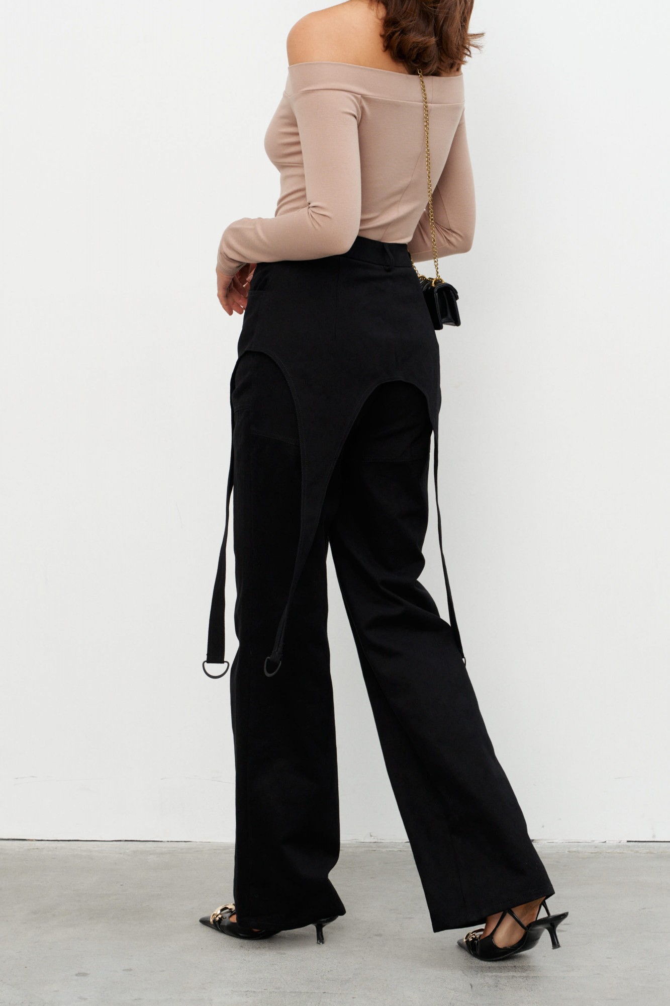 Брюки прямого силуэта из плотного джинса с баской. Брюки на поясе со шлёвками и застёжкой на пуговицу-болт и молнию. Чуть ниже шва сидения идут подрезы имитирующие по форме мини-шорты. По переду два прорезных кармана, по спинке - два накладных.