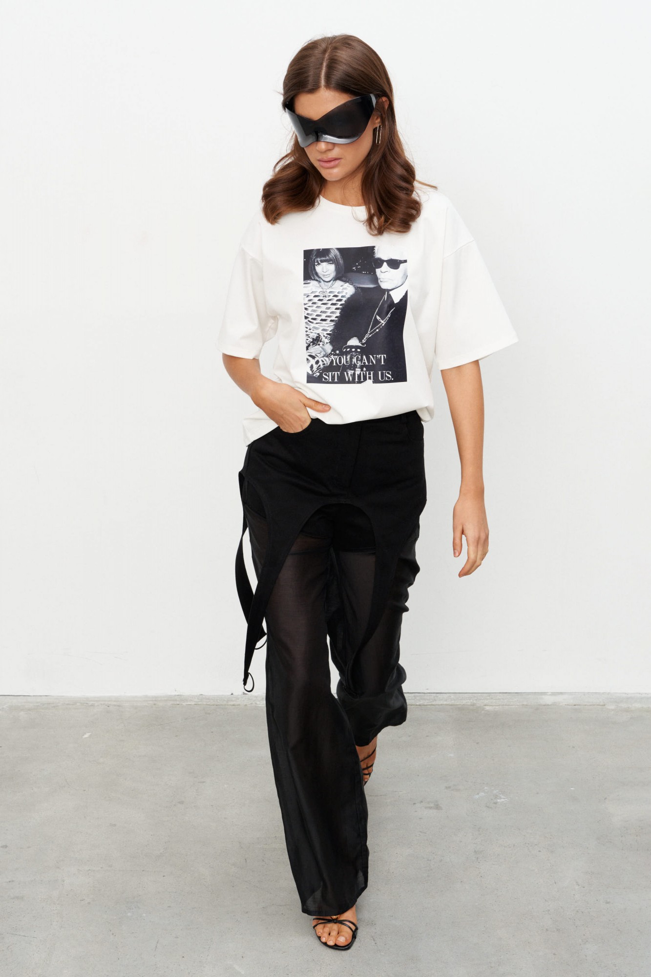 Брюки прямого силуэта с баской выполнены на сочетании плотного джинса и полупрозрачной вискозной вуали. Брюки на поясе со шлёвками и застёжкой на пуговицу-болт и молнию. Чуть ниже шва сидения идут подрезы имитирующие по форме мини-шорты. От подрезов вниз брюки выполнены из вуали. По переду два прорезных кармана, по спинке - два накладных.