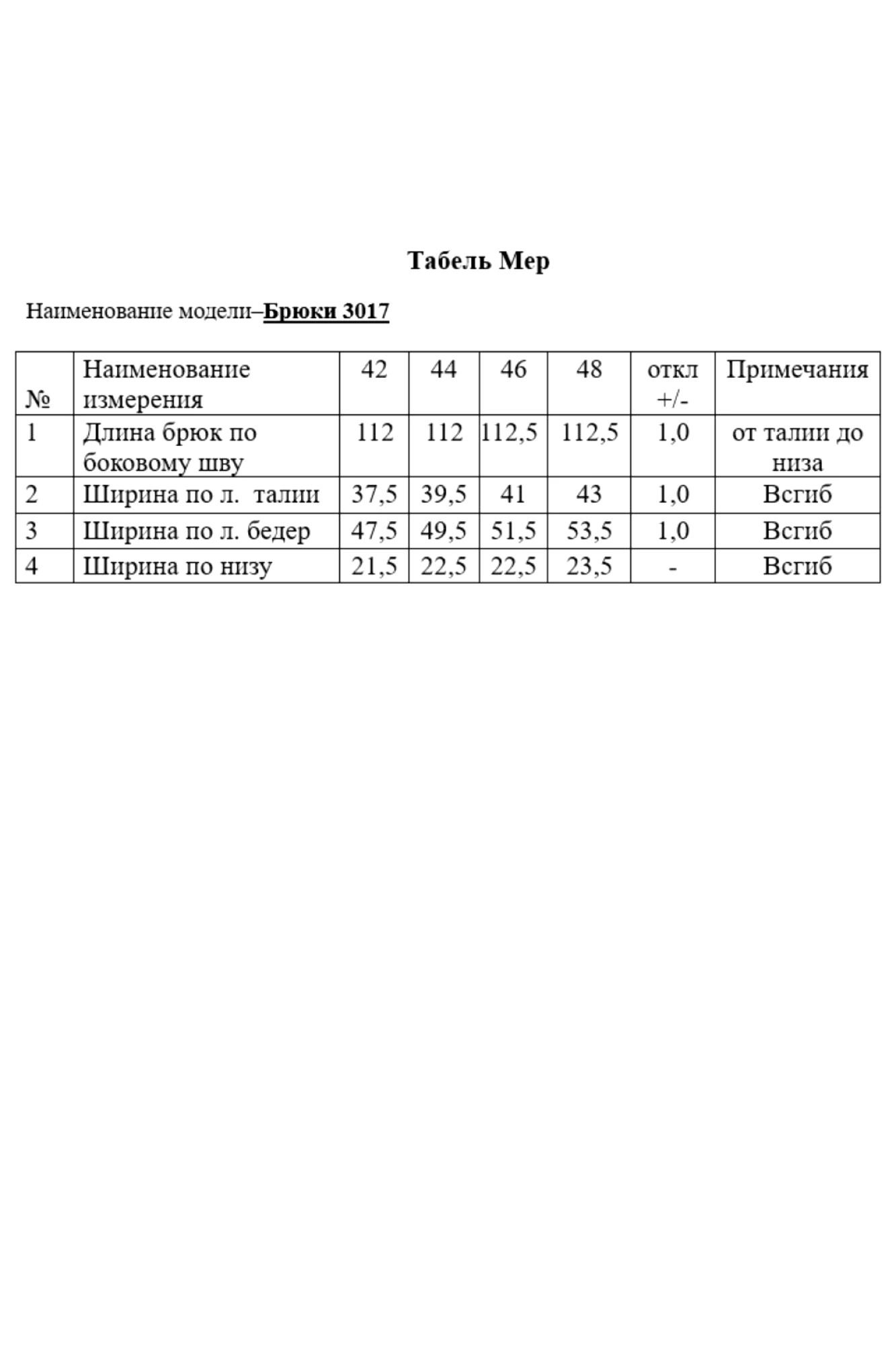 Таблица размеров