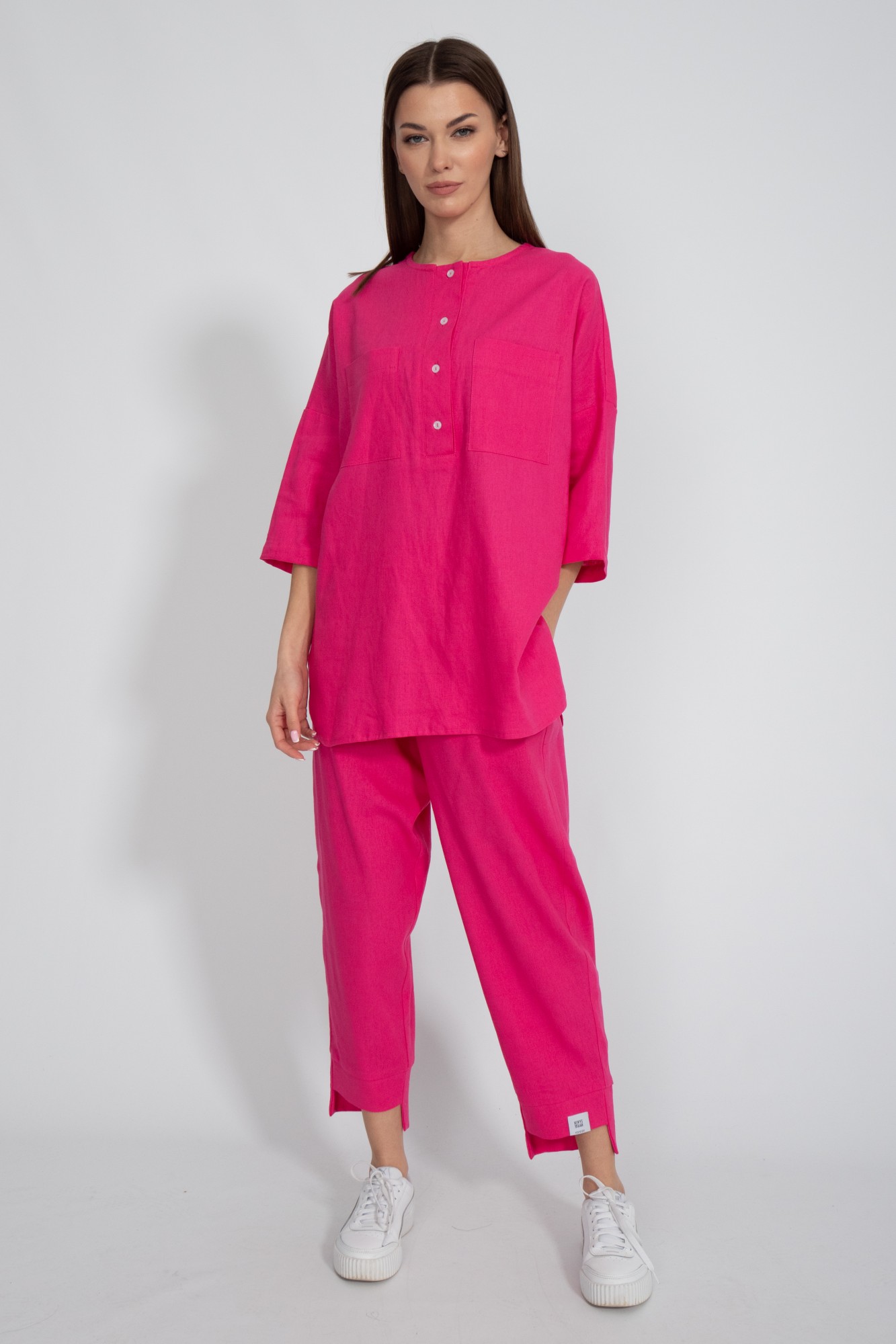 Джоггеры льняные с оборкой по верху пояса. С карманами в боковых швах. Низ джоггеров обработан манжетой, удлиненными по спинке. Отлично сочетаются с джемпером модели 4075, рубашкой модели 4073, 4070, 4081. Ткань лен. Рост 170.