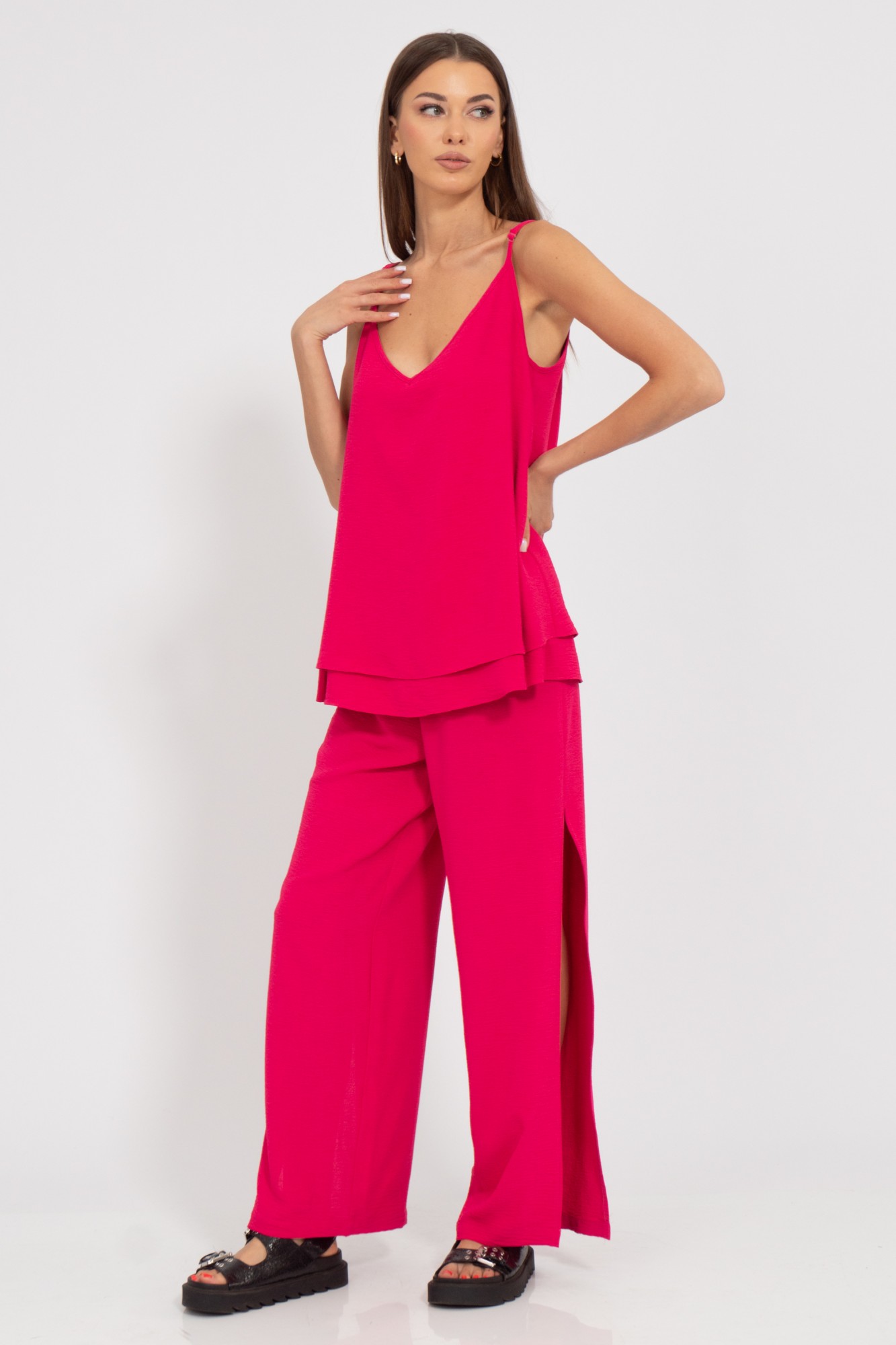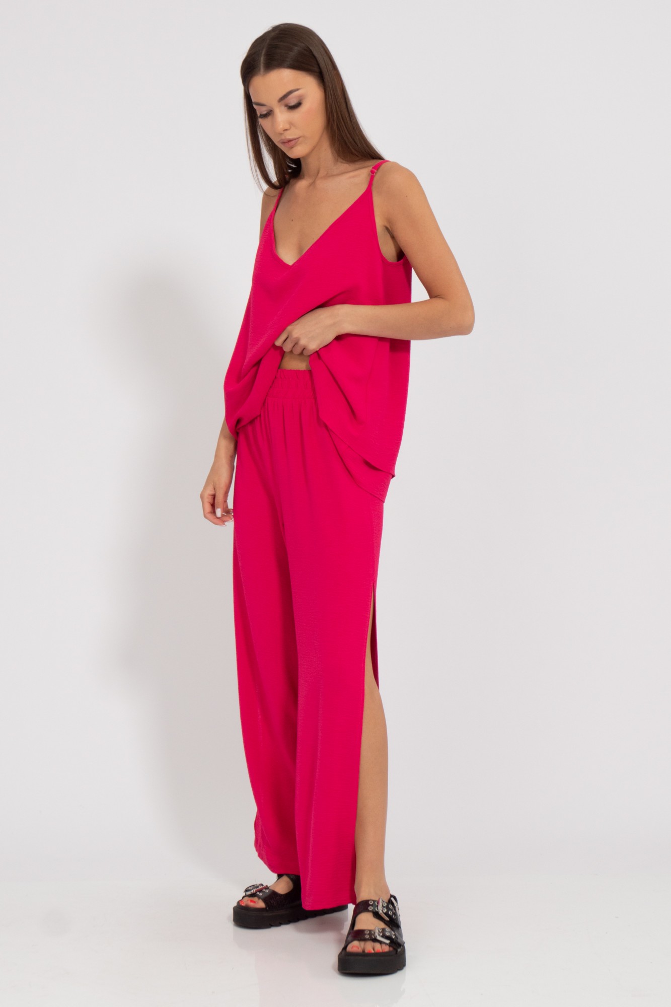 Брюки палаццо с разрезами по бокам — идеальный выбор для тех, кто ищет комфорт и стиль. Эти брюки имеют пояс-резинку, что обеспечивает идеальную посадку на талии. Отсутствие карманов делает их более универсальными и позволяет экспериментировать с образами. Изготовлены из лёгкой и приятной к телу ткани, эти брюки идеально подойдут для тёплой погоды.