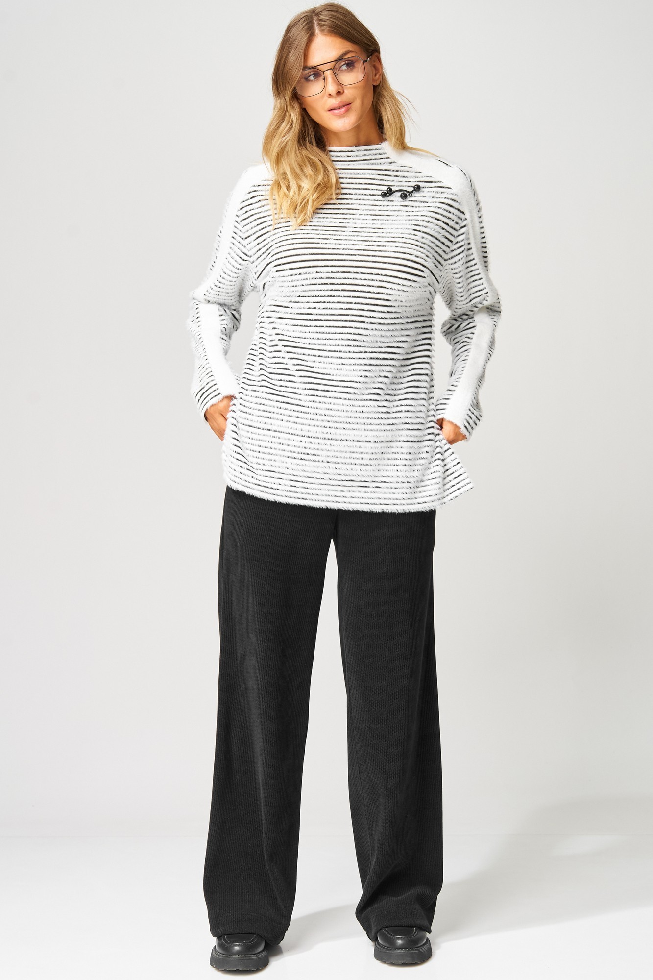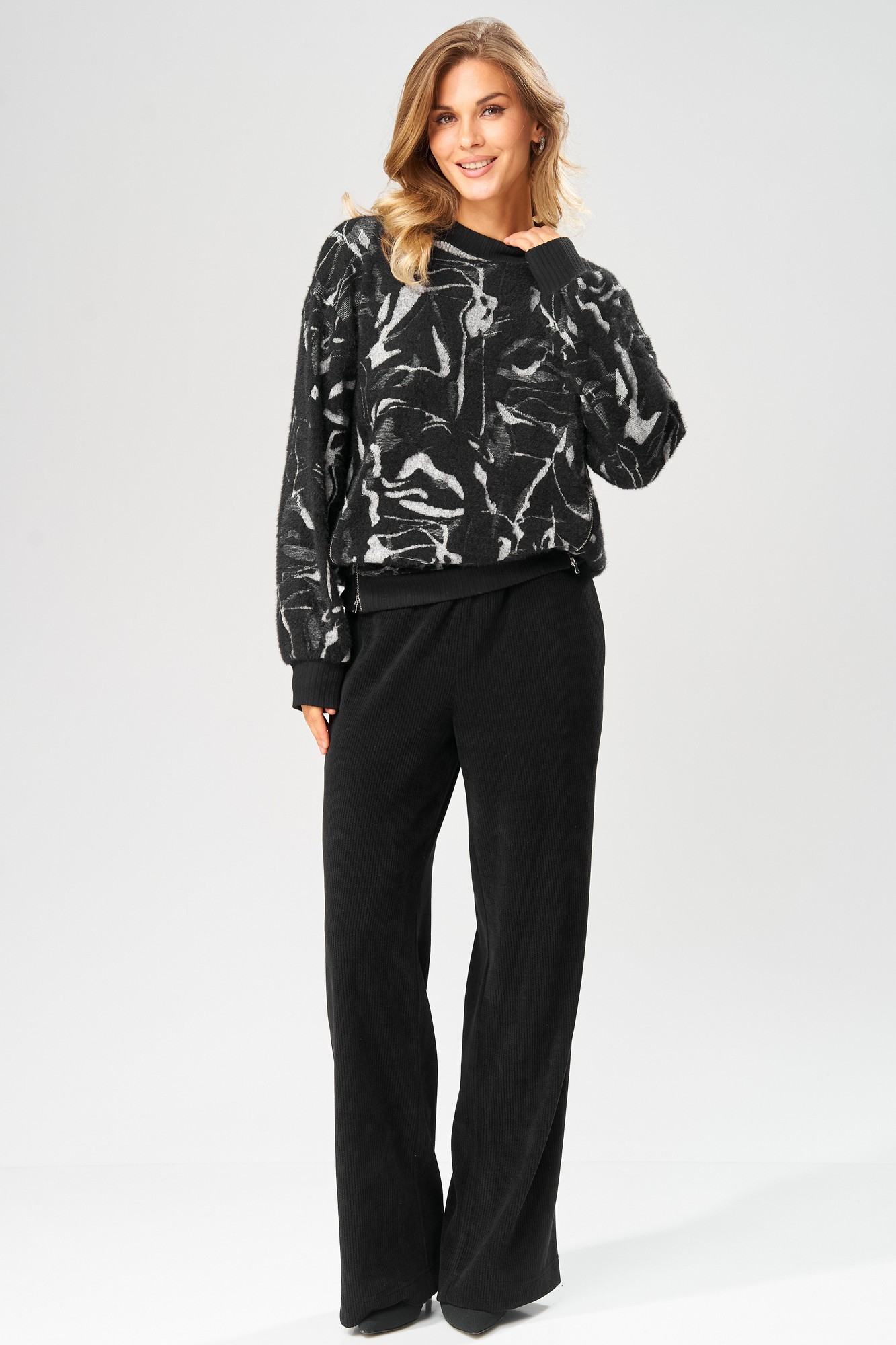 Брюки от LAIKONY из модного трикотажного вельвета. Брюки на талии, плотно облегающие вверху и прямые к низу. Пояс притачной, в пояс вставлена эластичная тесьма. На передних половинках брюк застрочены стрелки, в боковых швах обработаны карманы. Мягкий и пластичный трикотажный вельвет хорошо тянется в двух направлениях, малосминаем, средней плотности. Наши модные брюки идеально подойдут как к повседневному, так и праздничному образу. Идеально сочетается с нашими джемперами L-104, L-583 и L-642-1, а также входит в состав комплекта L-693.