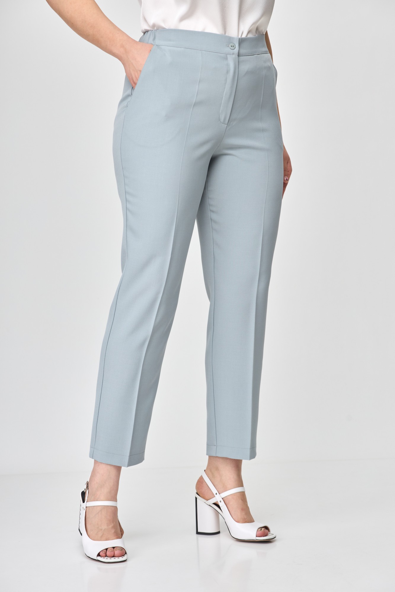Брюки со стрелками, длиной до косточки. В области бедер прилегающие, в колене свободные и к низу зауженые. По передним половинкам выполнены карманы и застежка на молнию в среднем шве. По задним половинкам выполнены талиевые вытачки. Брюки на притачном поясе с эластичной тесьмой и застежкой на петлю и пуговицу спереди.