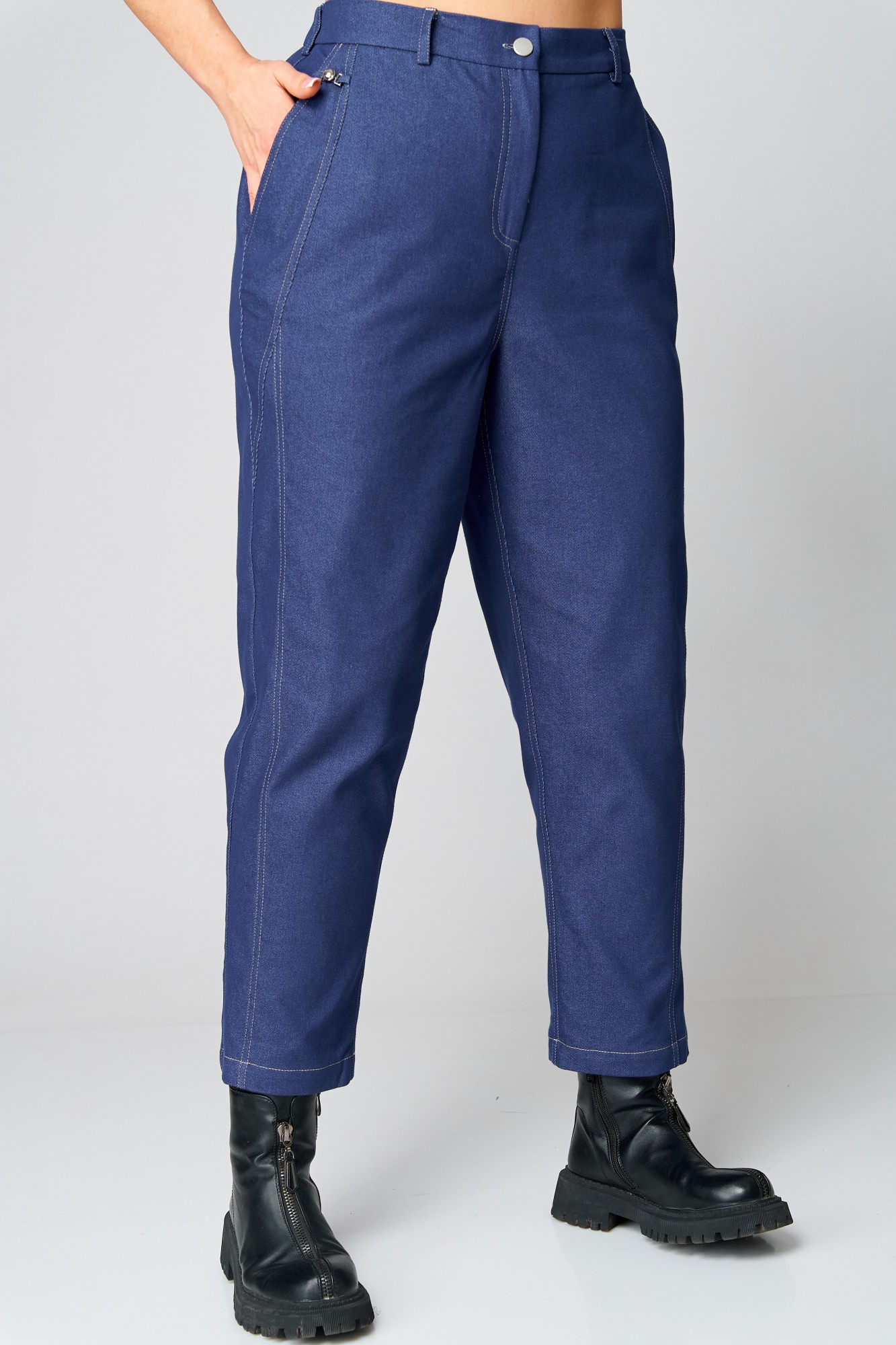 Брюки женские, выполнены из джинсовой ткани. Передние половинки с вертикальными подрезами, с боковыми карманами, задние половинки с кокетками и накладными карманами. Застёжка спереди на молнию, пояс по спинке с резинкой. По подрезам, карманам, шаговым и среднему швам проложены двойные отделочные строчки.
