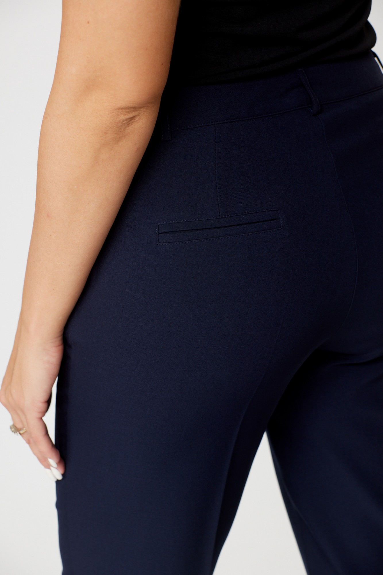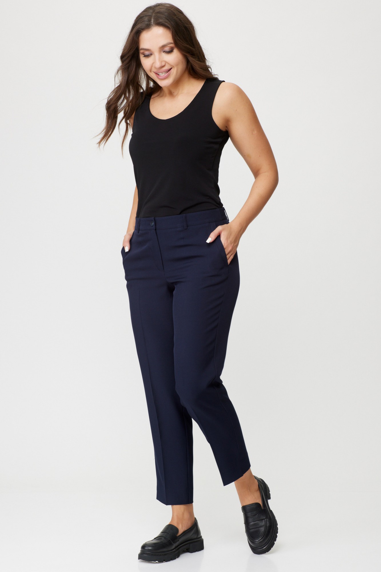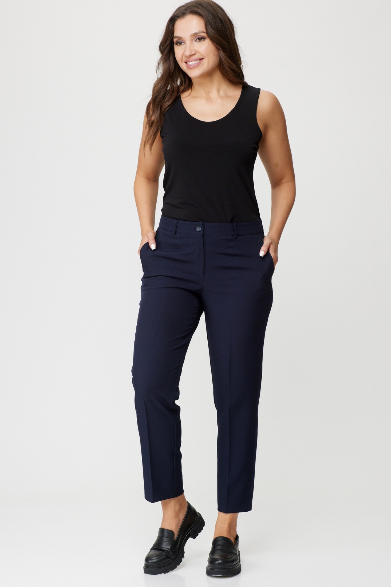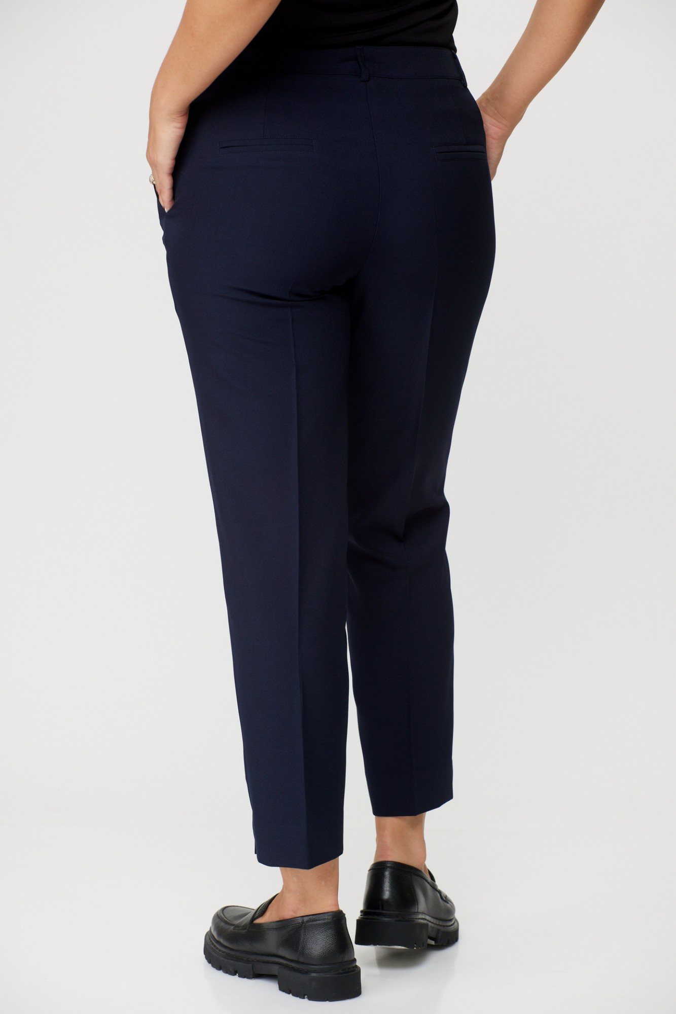 Брюки классические, из плотной текстильной ткани, прямые, слегка заужены к низу, заутюжены стрелки, по переду обработаны карманы с отрезным бочком, застежка на тесьму-молнию и 1 пуговицу. На задних половинках обработаны вытачки и имитация карманов в рамку с двумя обтачками, пояс в брюках притачной, без резинки.По низу брюк в боковом шве есть небольшой разрез.