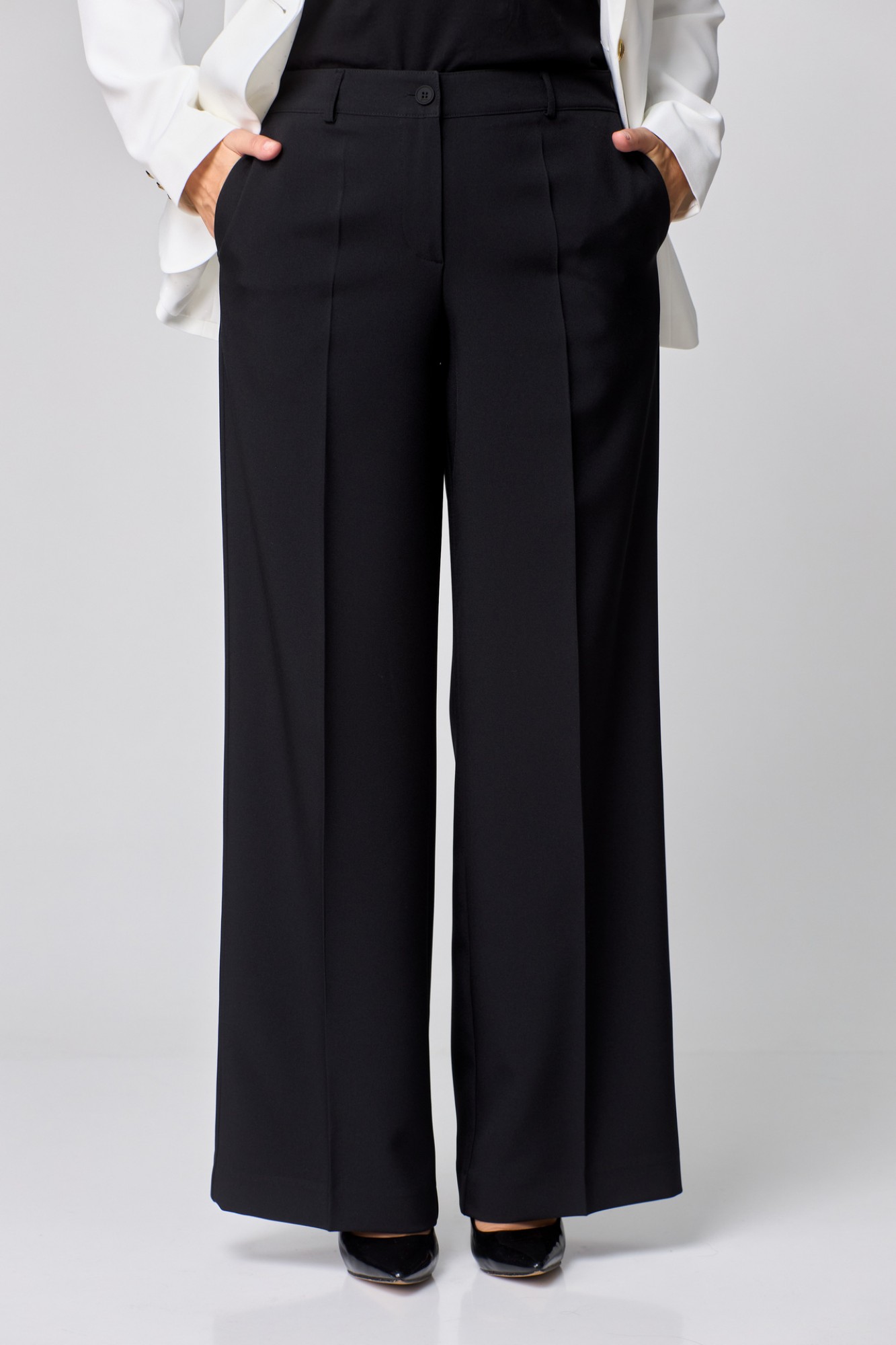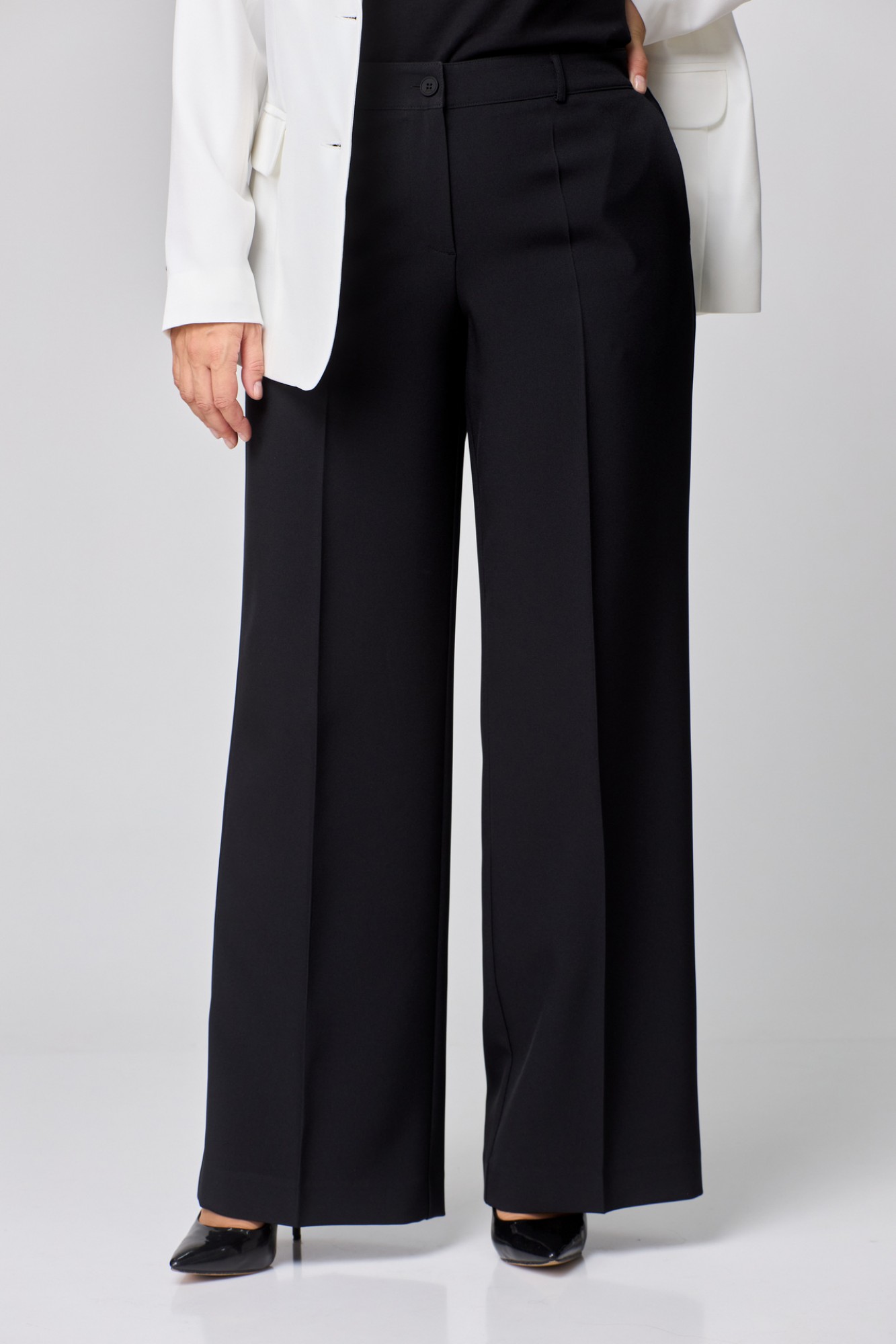 Брюки-палаццо,средней ширины,из текстильной ткани, выполнены с карманами с отрезным бочком в боковом шве. Пояс притачной, застёжка на молнию. По задним половинкам обработаны вытачки.